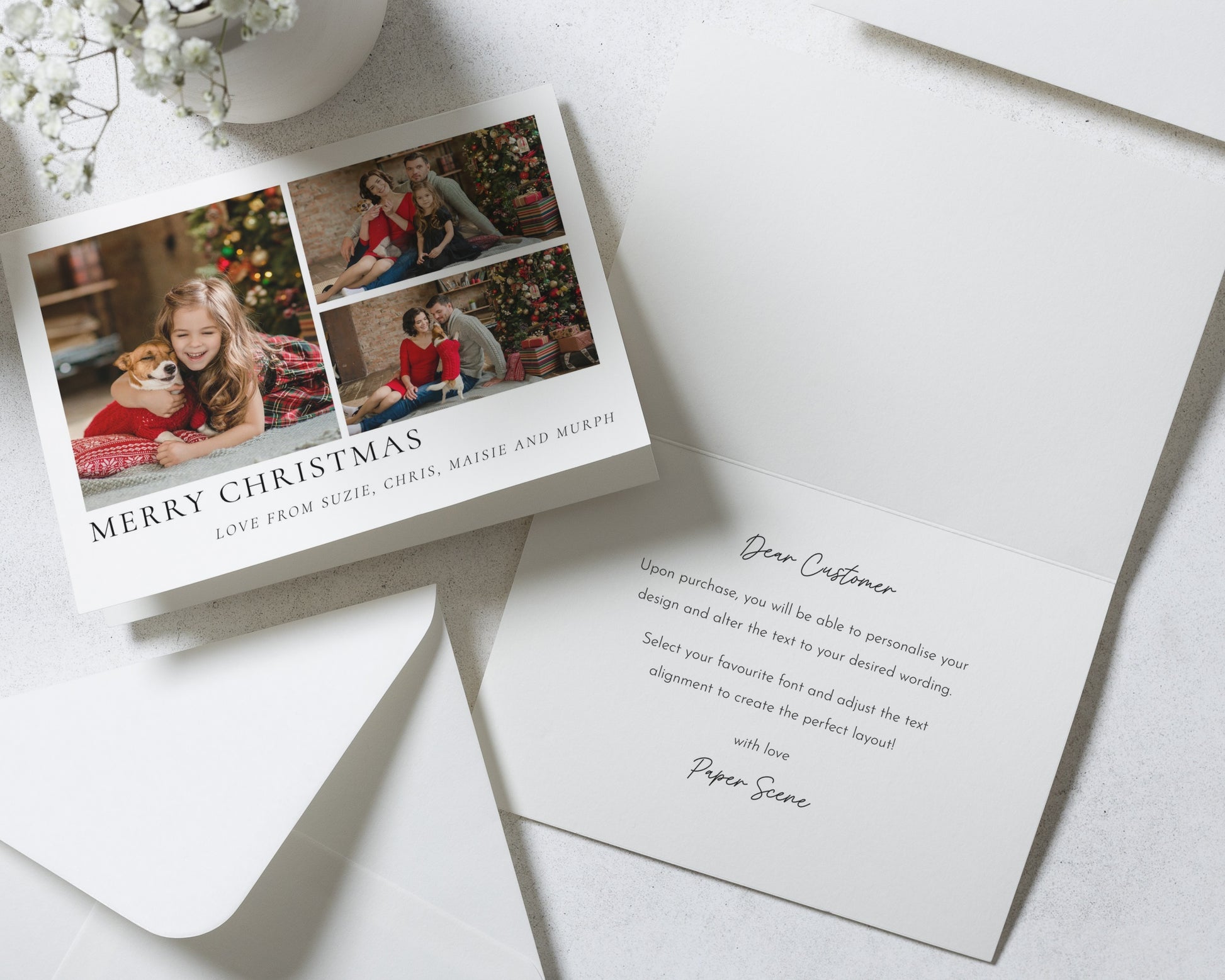 Share your festive cheer with this elegant personalised photo Christmas card, featuring space for three of your favourite family photos and custom names.