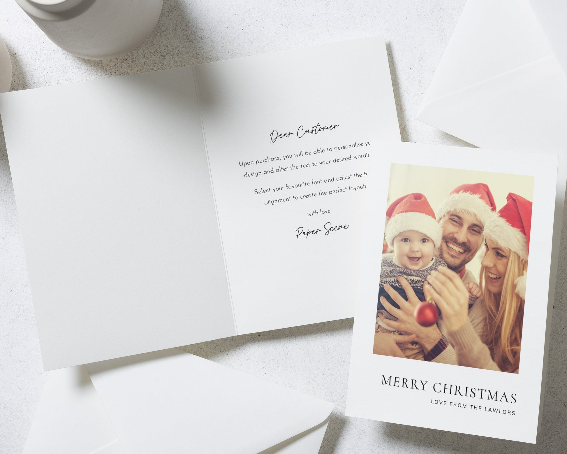 Share festive cheer with this personalised photo Christmas card, featuring your favourite family photo and custom text for a truly special touch.