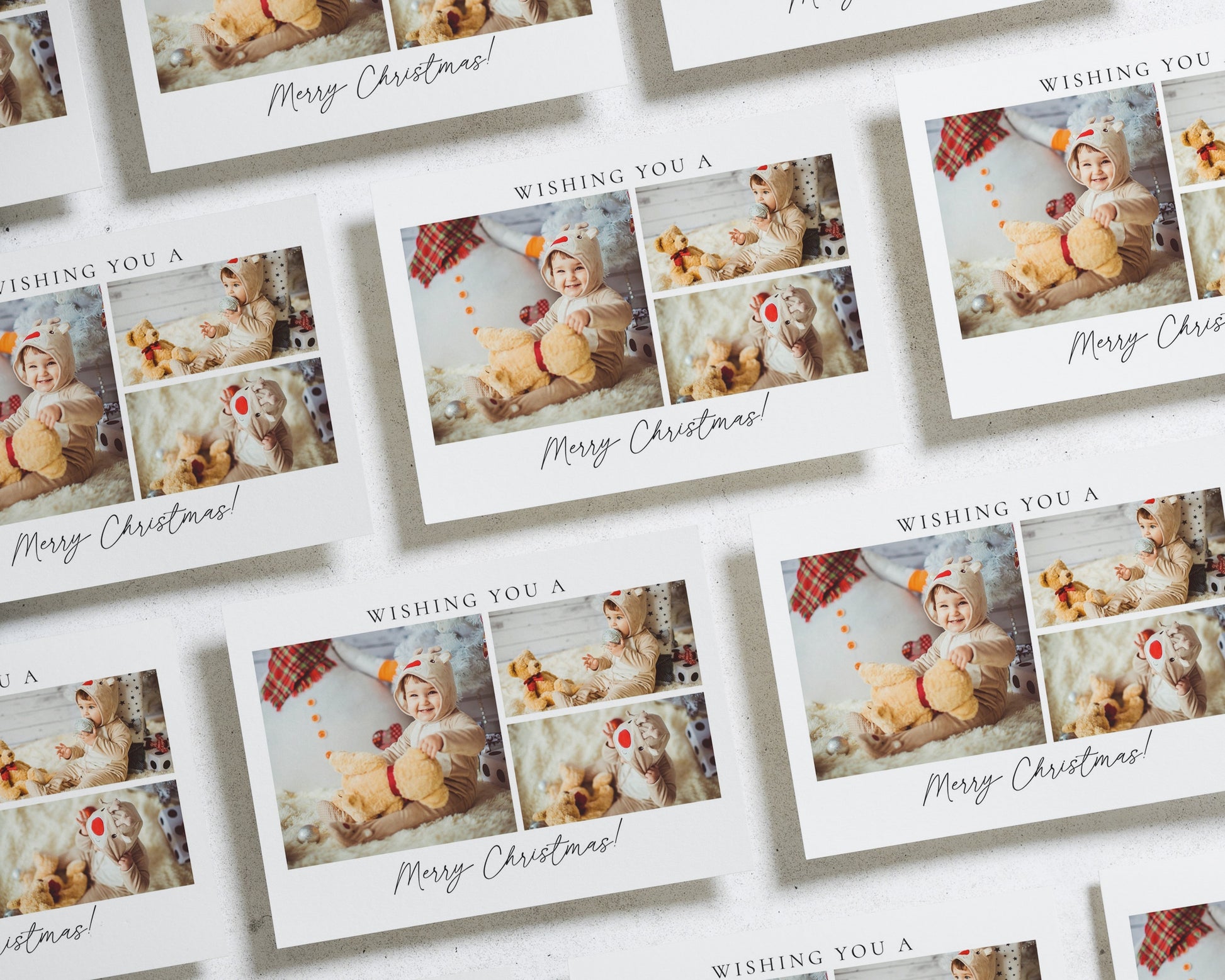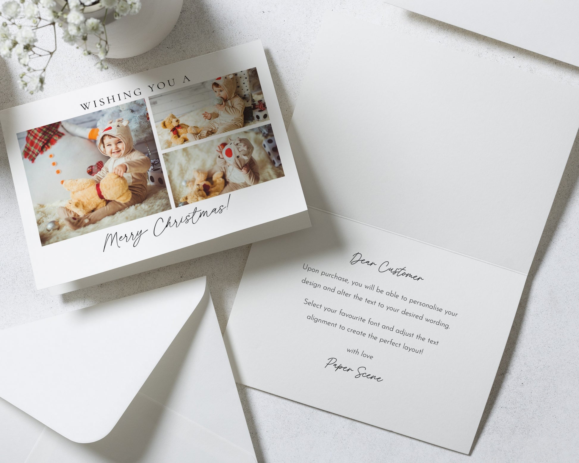 Share your favourite festive memories with this personalised photo Christmas card. Featuring space for three photos and a modern Merry Christmas message, it's perfect for sending a personal touch to loved ones.