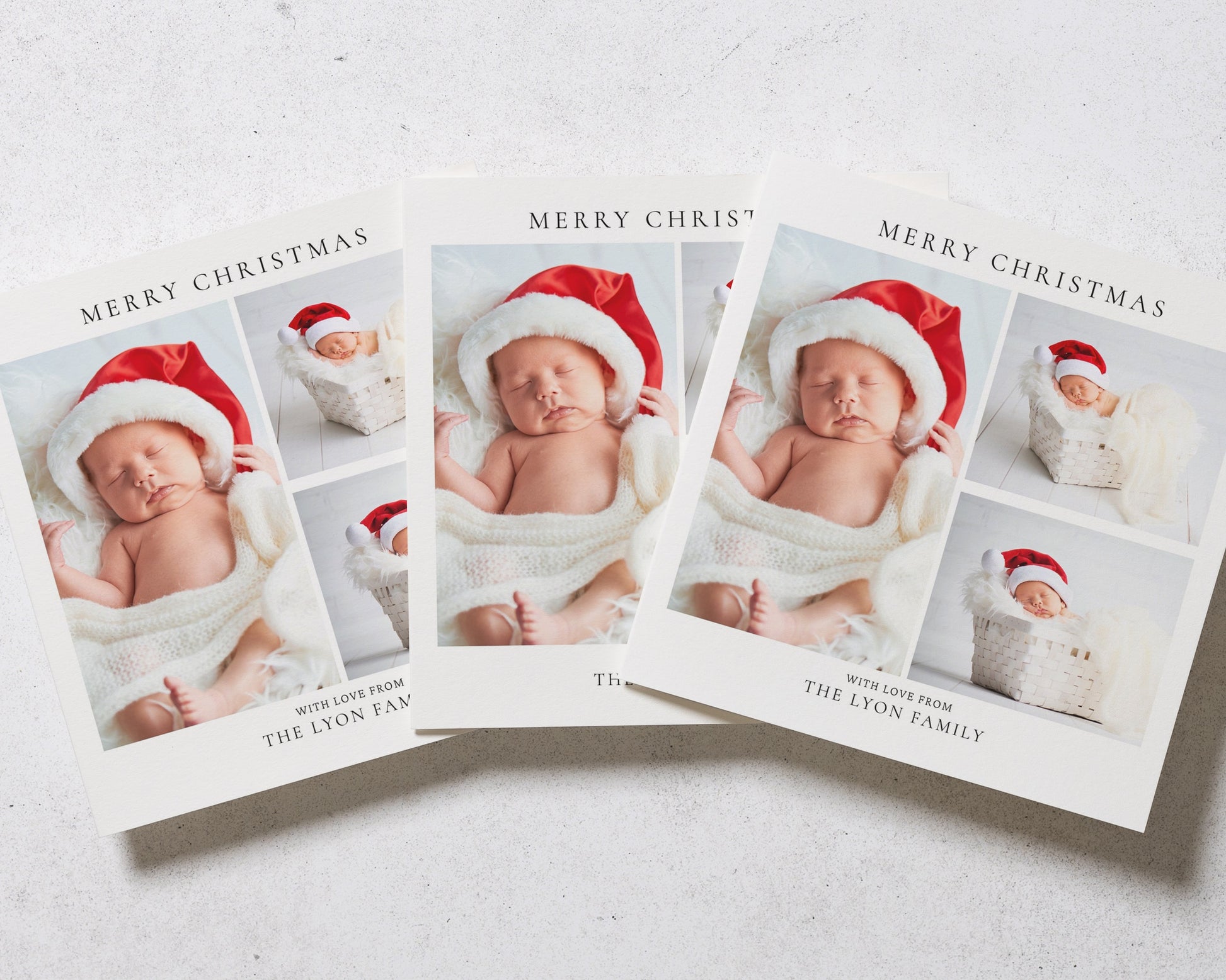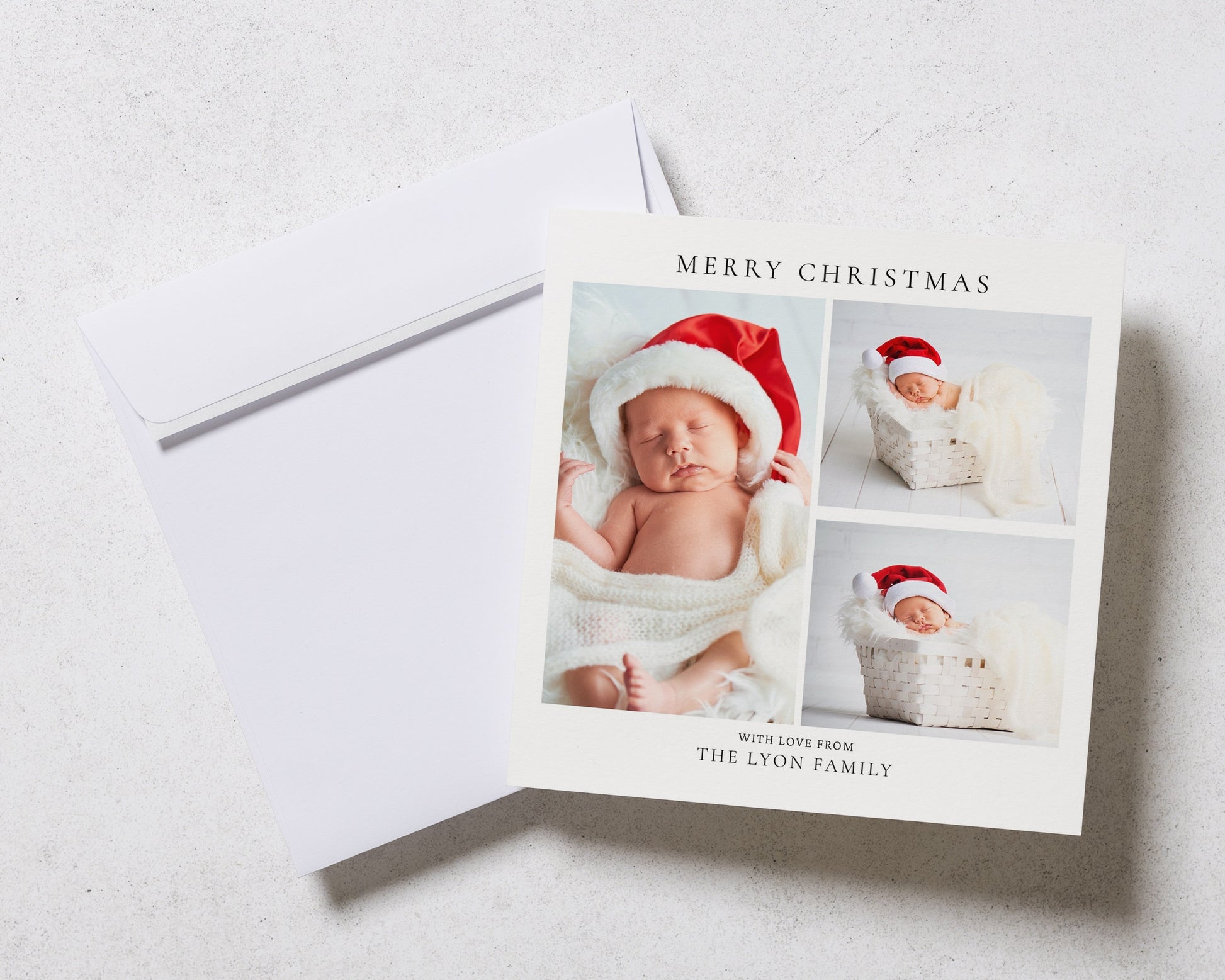 Celebrate the season with this personalised photo Christmas card, featuring a square layout and space for your family or baby photos. A perfect way to send festive wishes from your family to loved ones.