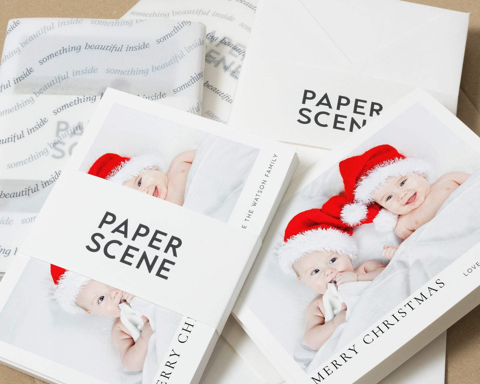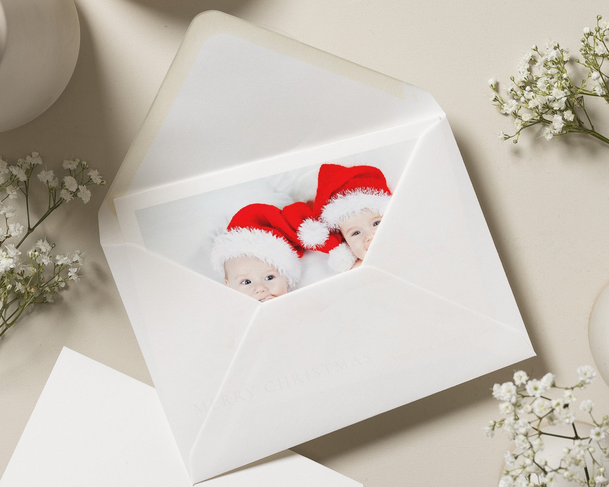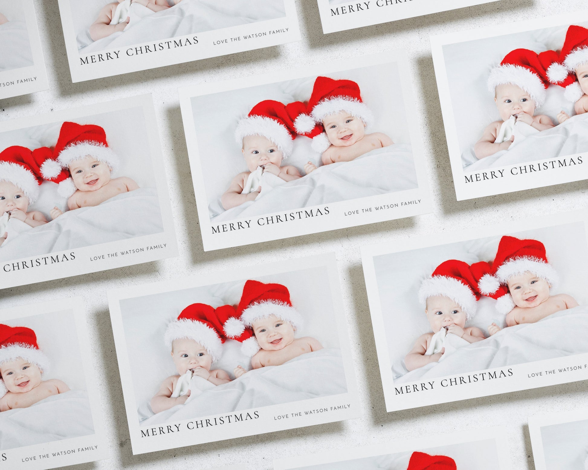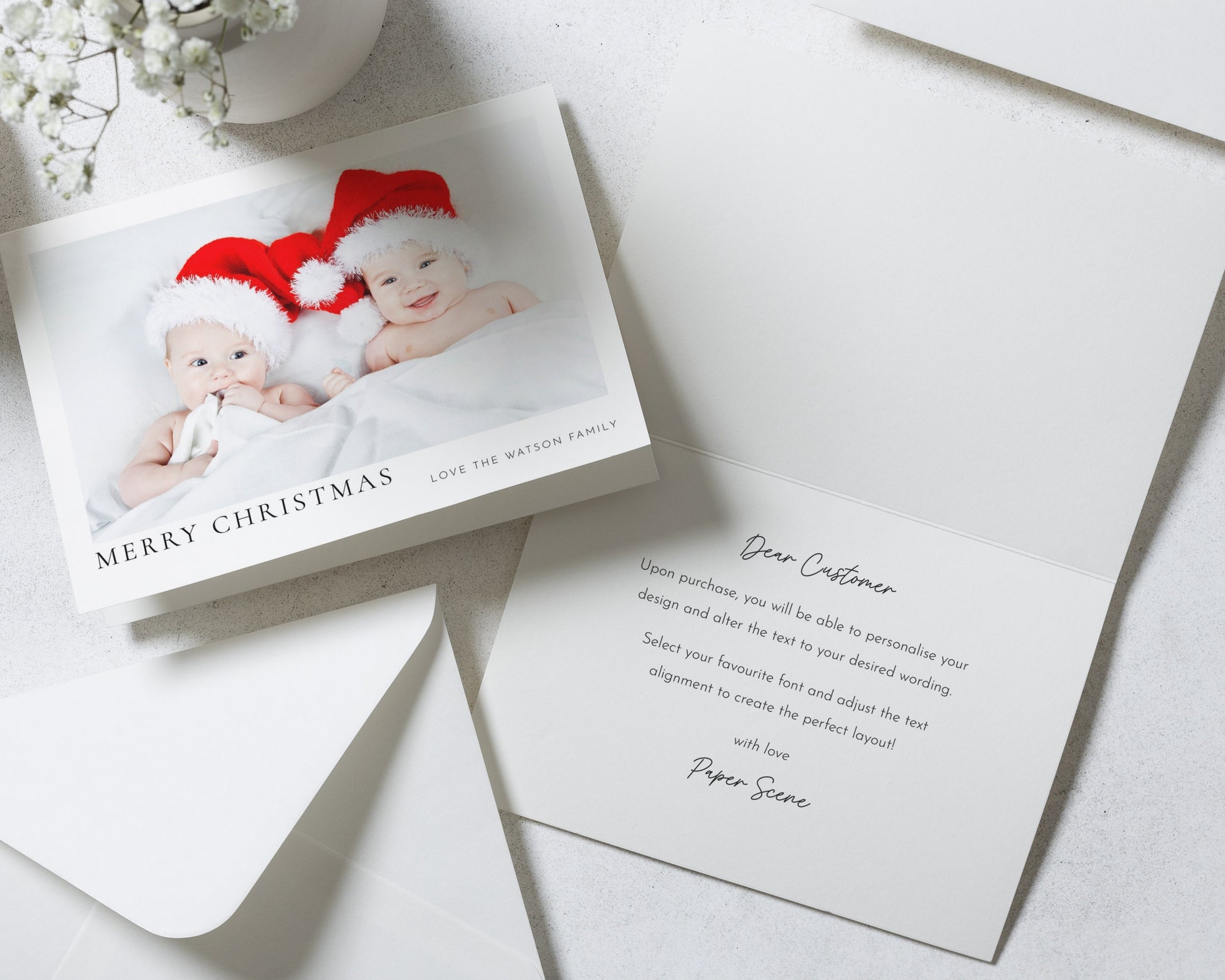 This personalised photo Christmas card features a sweet image of two babies in Santa hats, perfect for families wanting to share festive joy. Add your own photo and family name for a truly unique Christmas greeting.