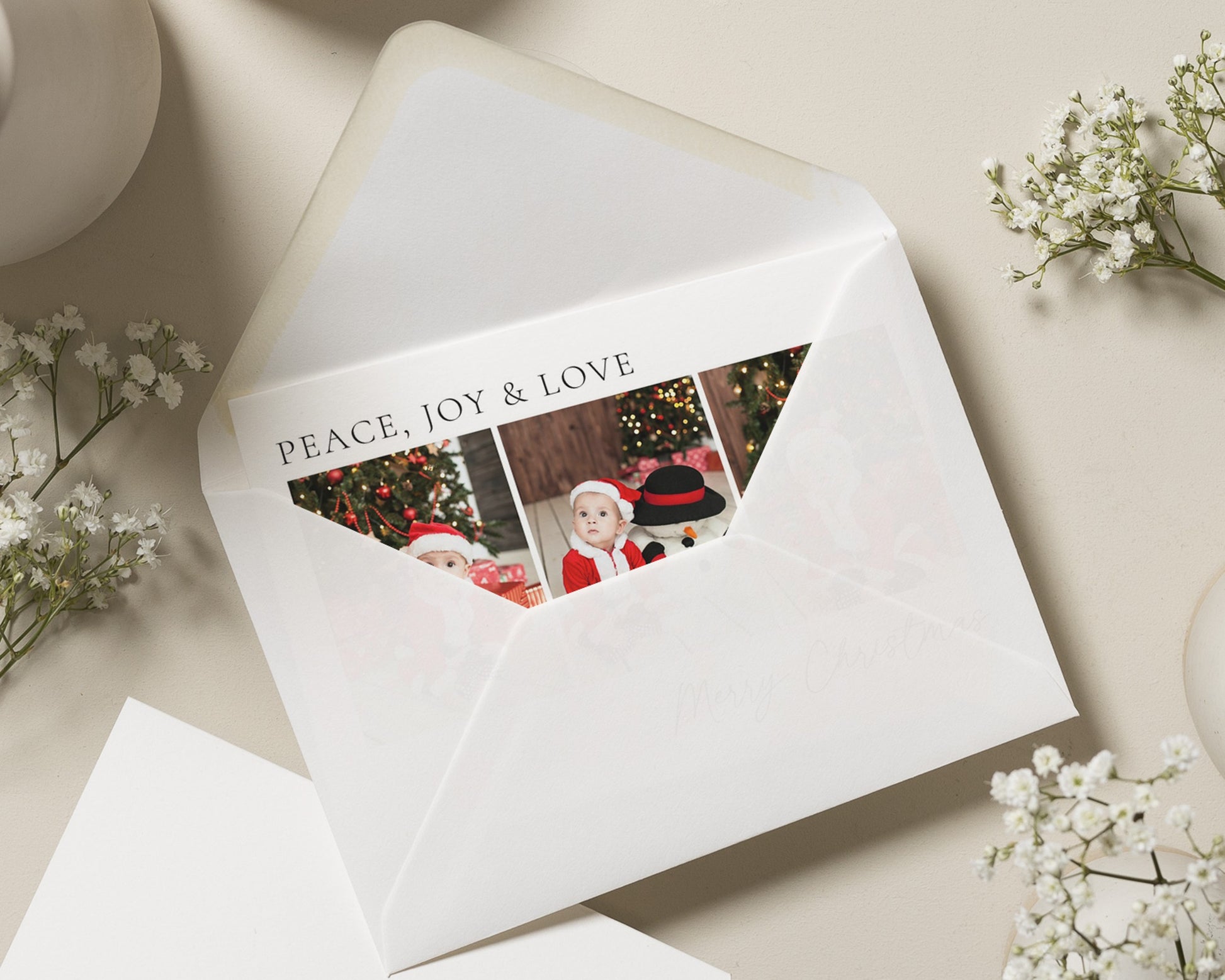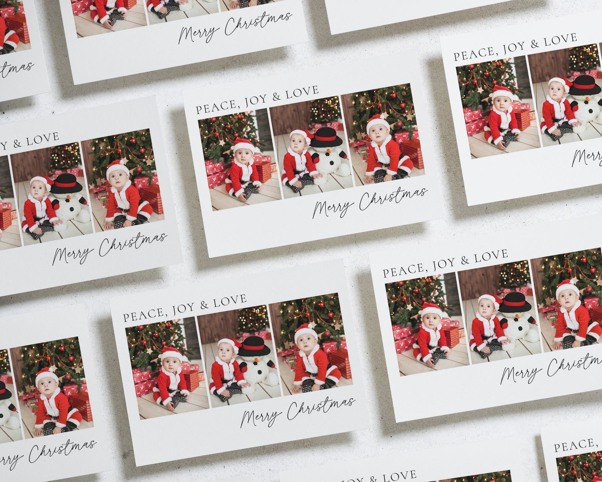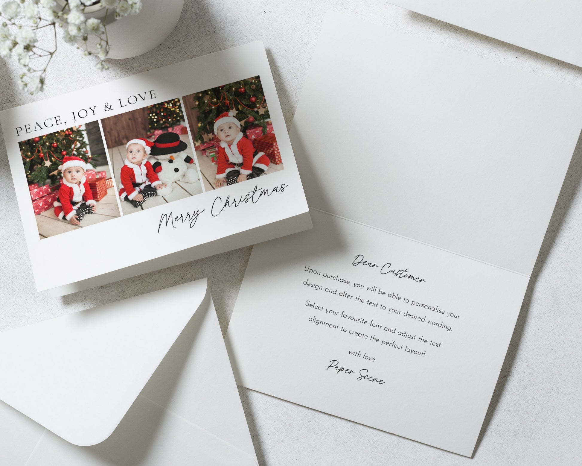 Celebrate the festive season with this elegant personalised photo Christmas card, featuring space for three of your favourite family photos and a modern, minimalist design with the greeting 'Peace, Joy & Love' and 'Merry Christmas'.