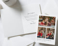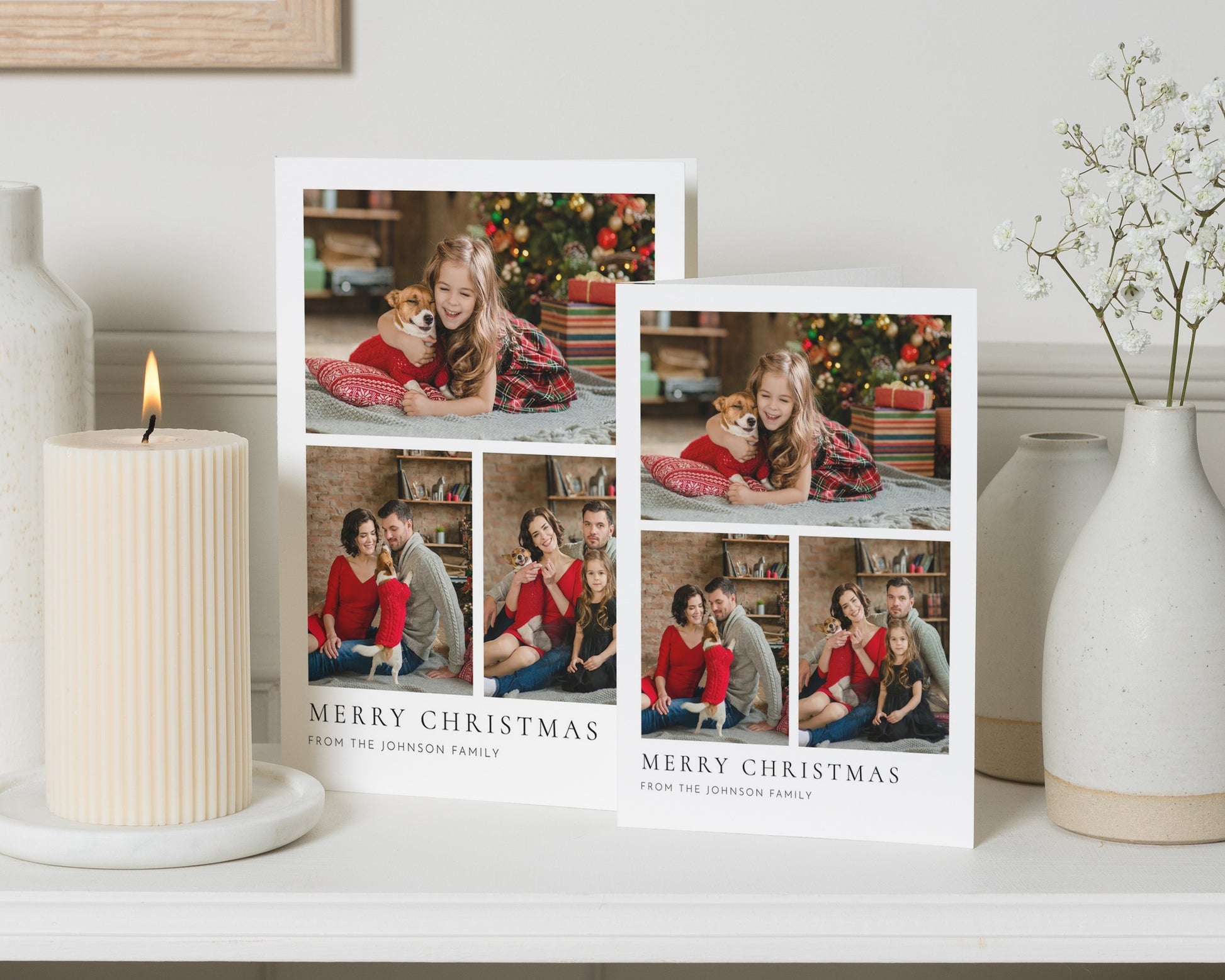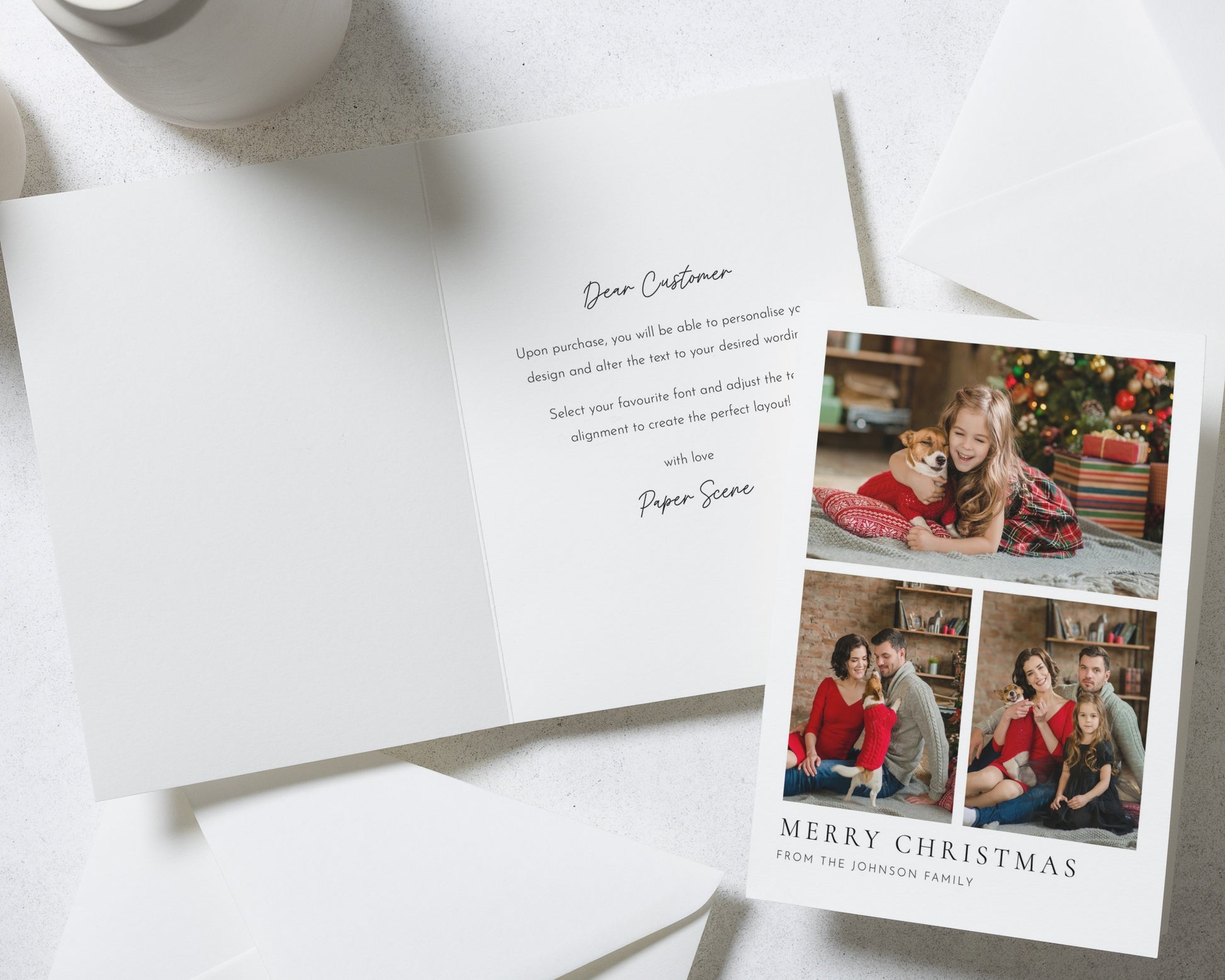 Celebrate the festive season with this elegant personalised photo Christmas card, featuring space for your favourite family photos and a custom family name.