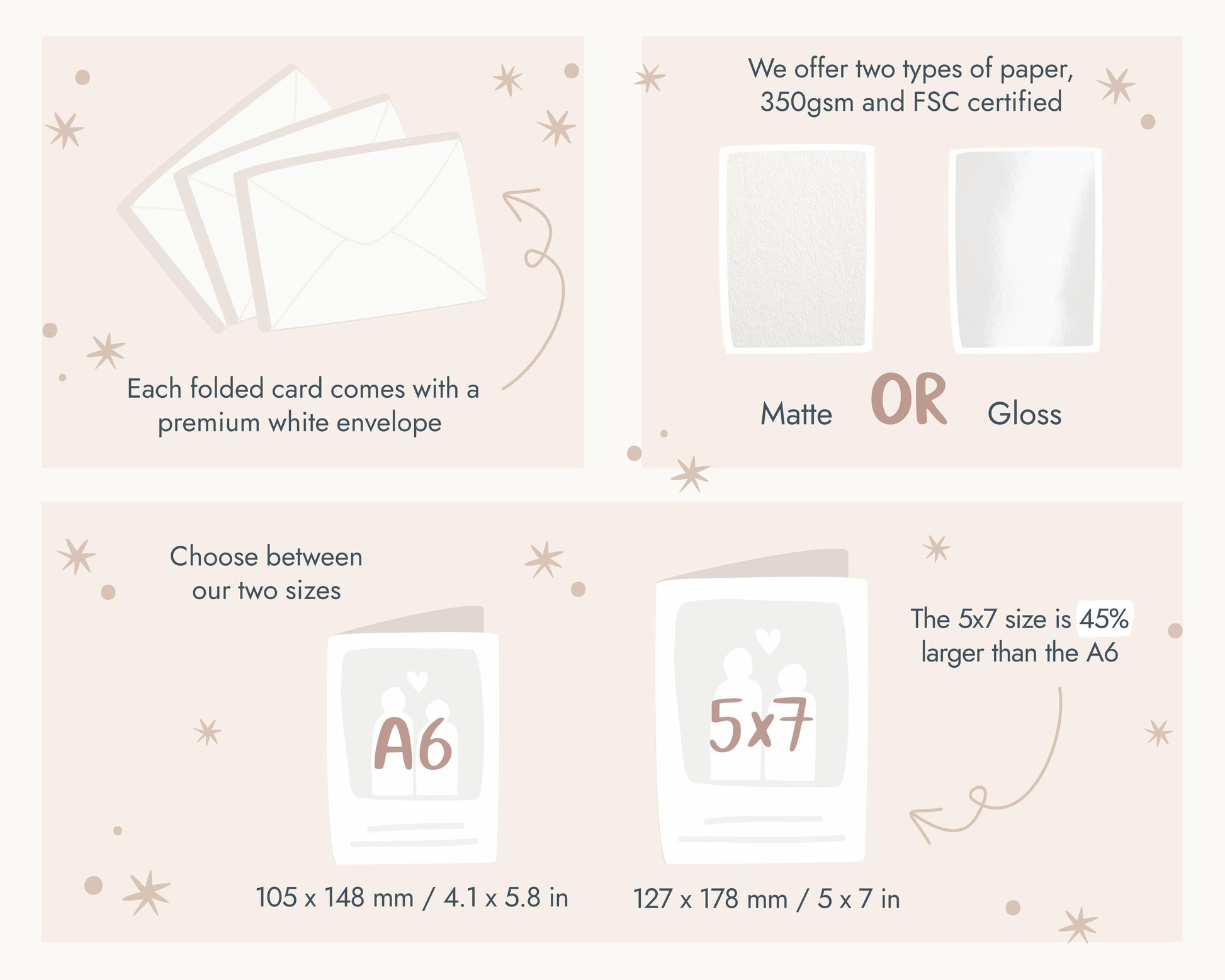 Choose from two classic folded greeting card sizes — perfect for your personalised message and photos: