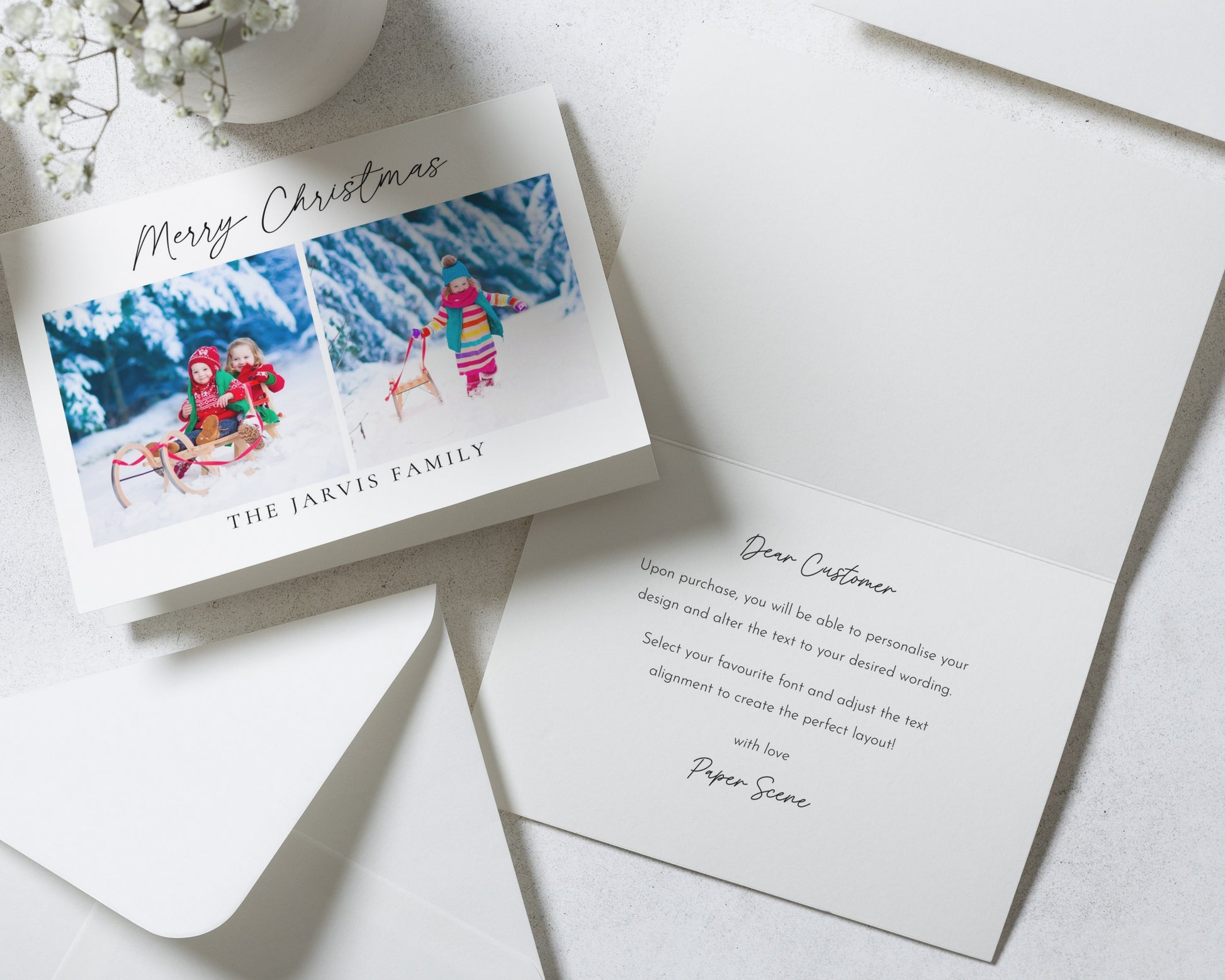 Share your favourite festive memories with this personalised photo Christmas card, featuring two photo spaces and your family name for a truly unique touch.