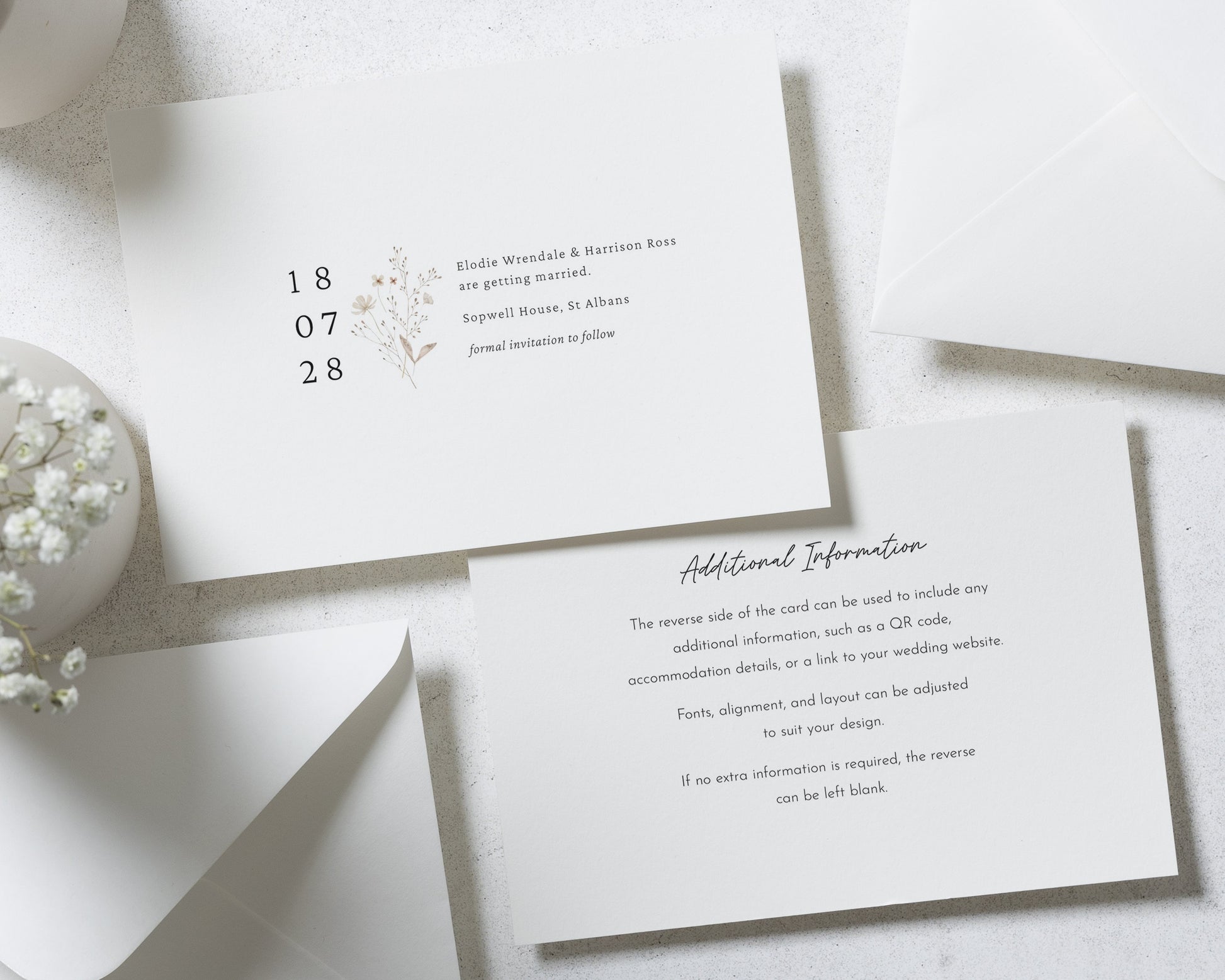 Our Save the Date cards are fully customisable – you can change all of the text to match your names, date, and wedding vibe. Whether you're planning a formal celebration or something more relaxed, we’ll help you create a design that feels uniquely you.