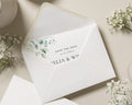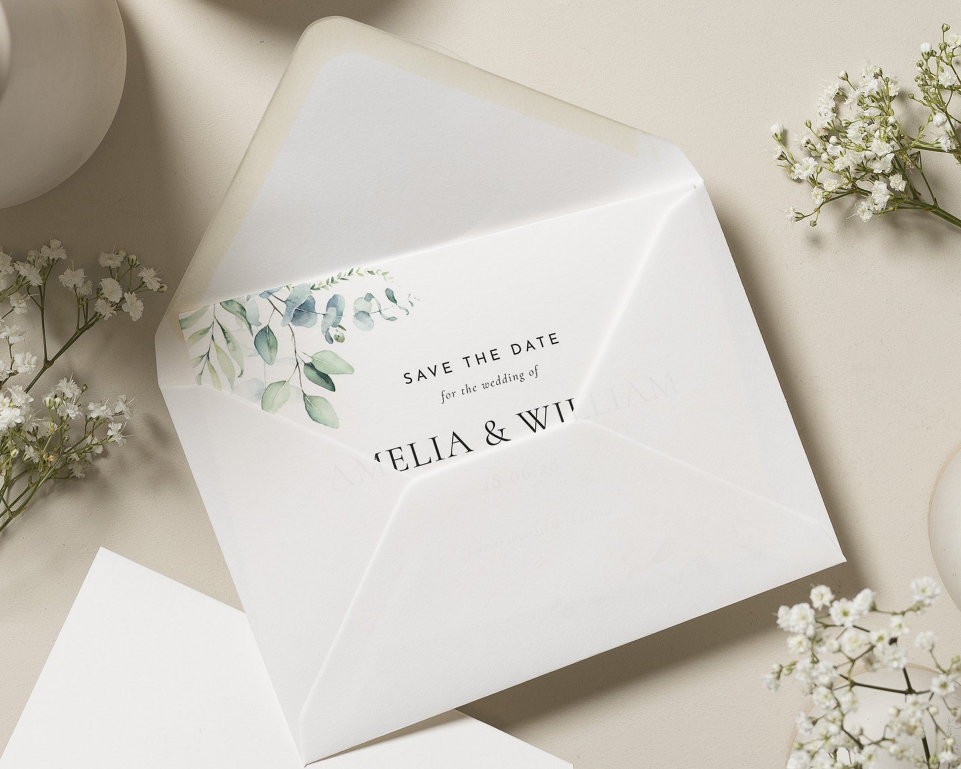 This elegant save the date card features a minimalist greenery design with delicate watercolour leaves, perfect for modern weddings.