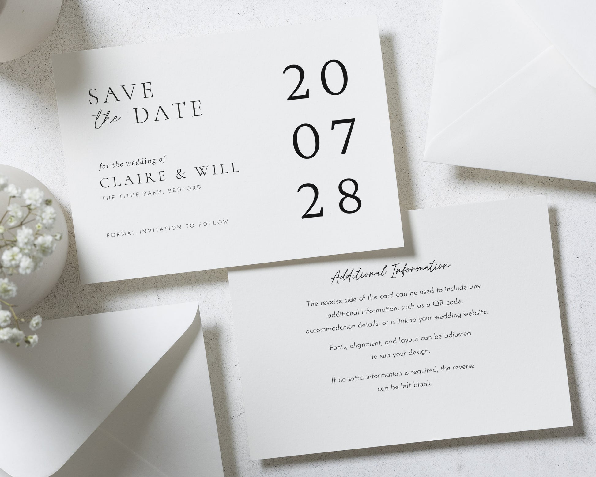 Announce your special day with this personalised minimal save the date card. Featuring a clean, modern design with bold date details, perfect for elegant weddings.