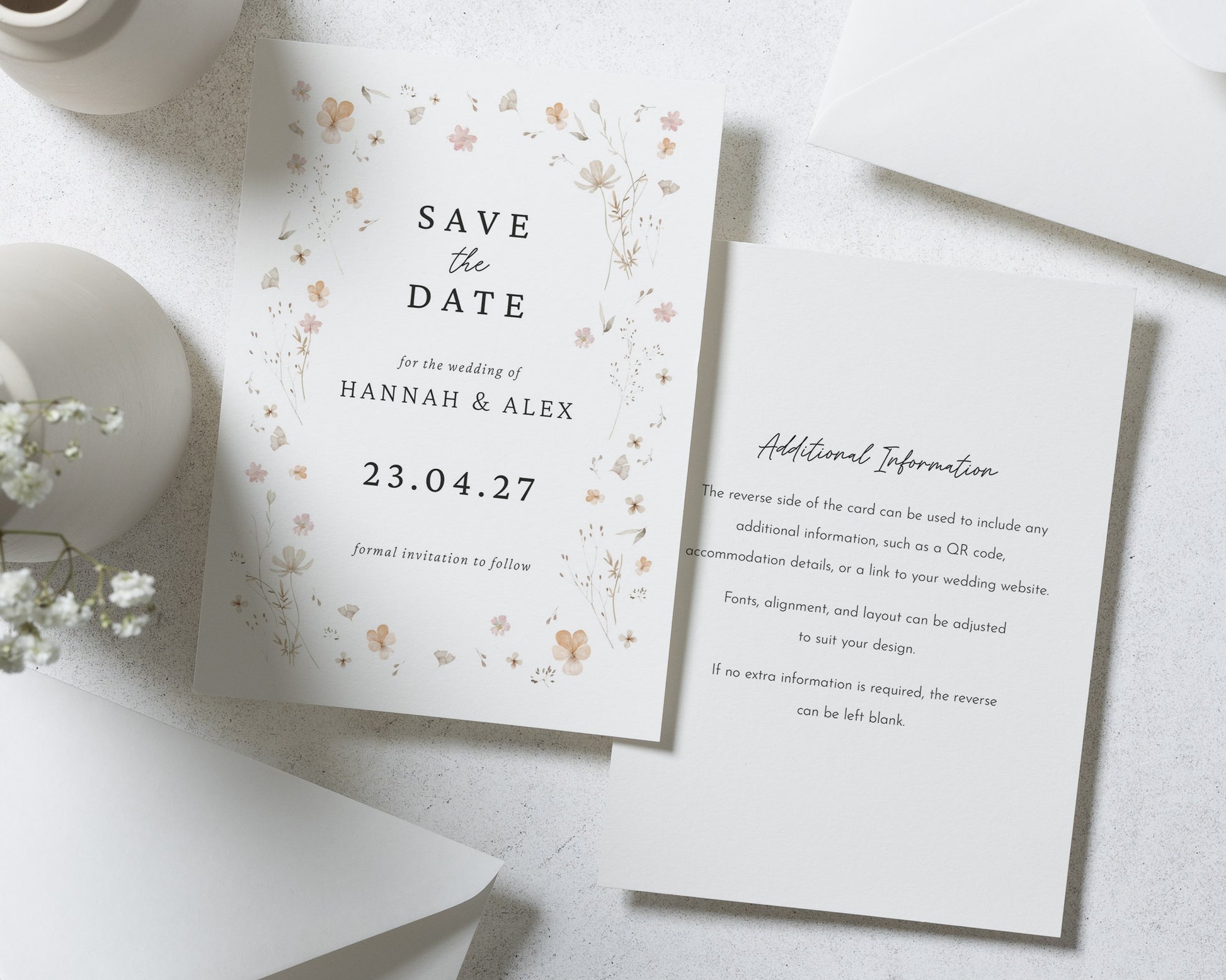 A delicate floral save the date card with soft wildflower illustrations and elegant script, perfect for announcing your wedding in a romantic, simple style.
