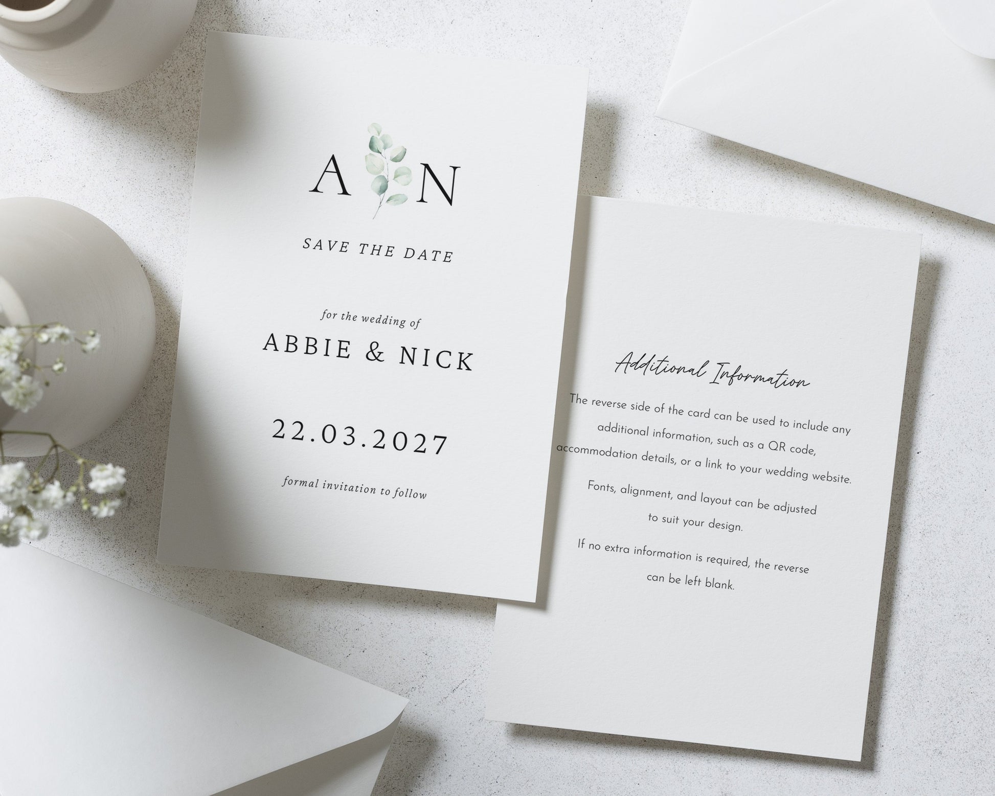 Our Save the Date cards are fully customisable – you can change all of the text to match your names, date, and wedding vibe. Whether you're planning a formal celebration or something more relaxed, we’ll help you create a design that feels uniquely you.