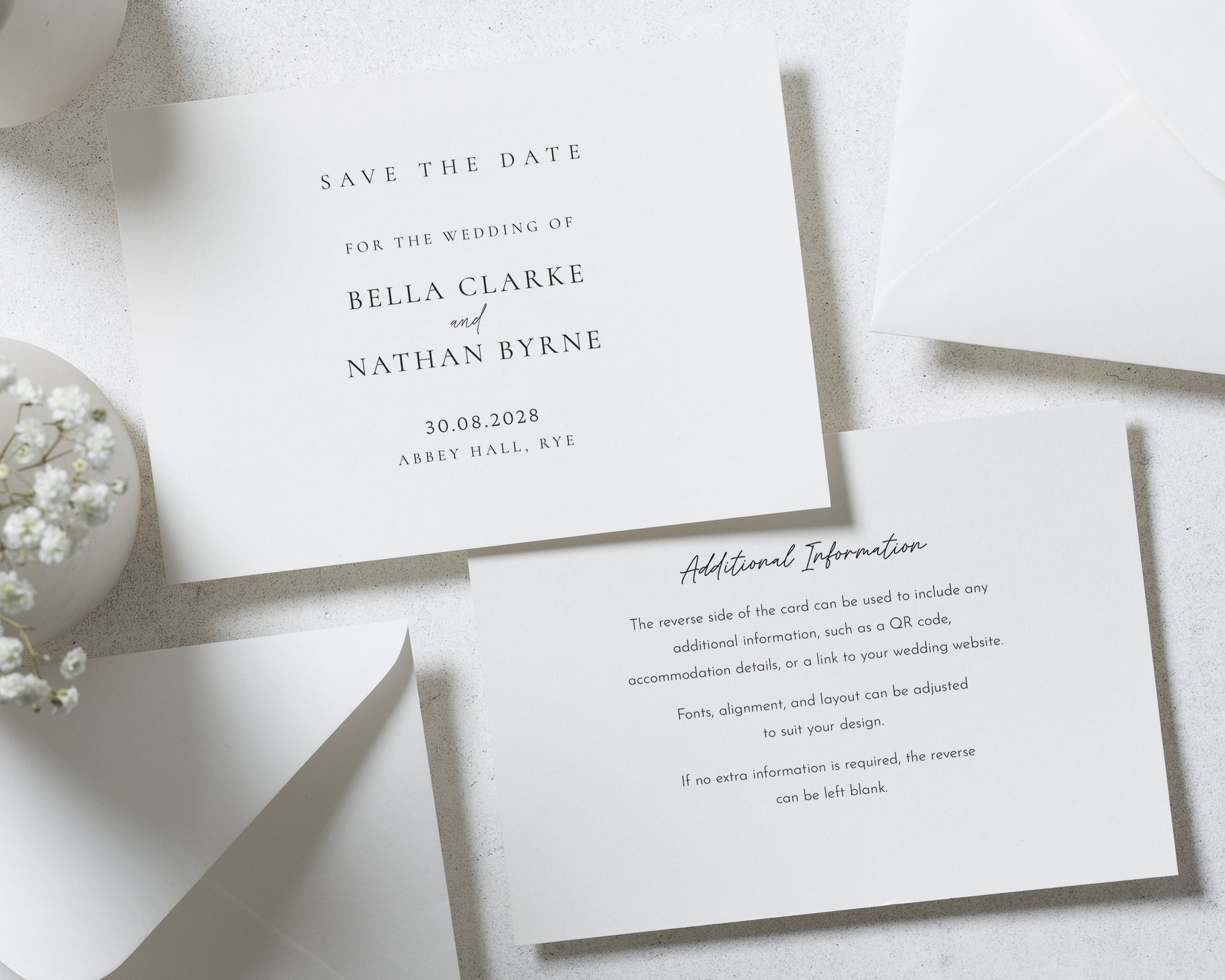 Announce your special day with this elegant, minimal save the date card. Featuring clean typography and a timeless design, perfect for modern couples.