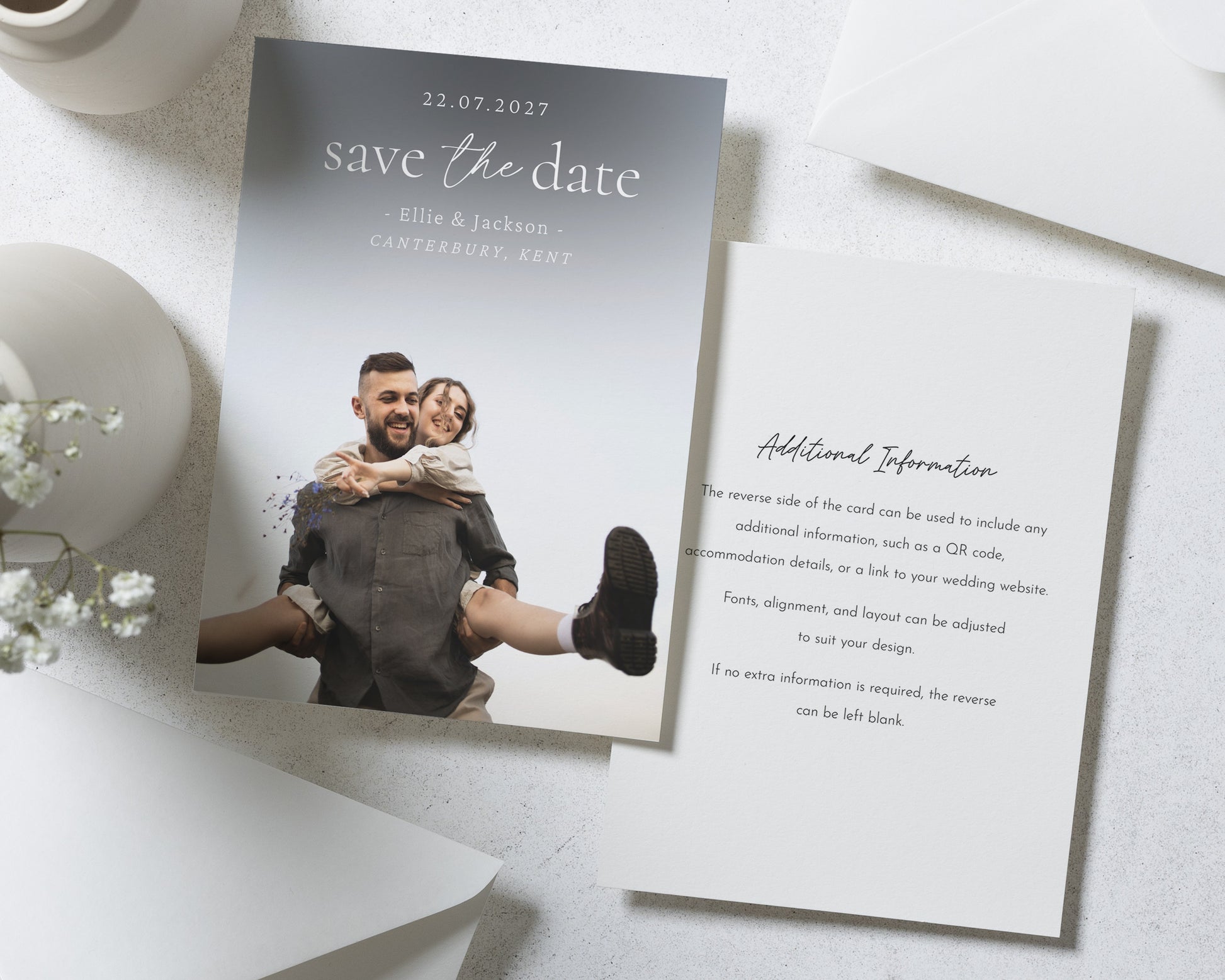 Our Save the Date cards are fully customisable – you can change all of the text to match your names, date, and wedding vibe. Whether you're planning a formal celebration or something more relaxed, we’ll help you create a design that feels uniquely you.