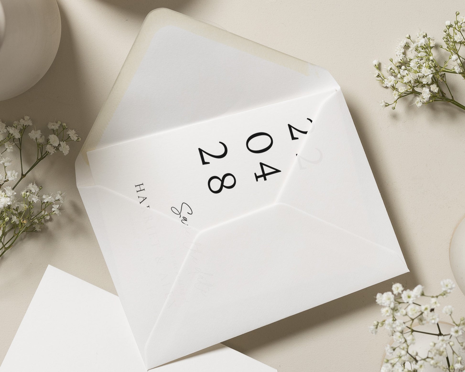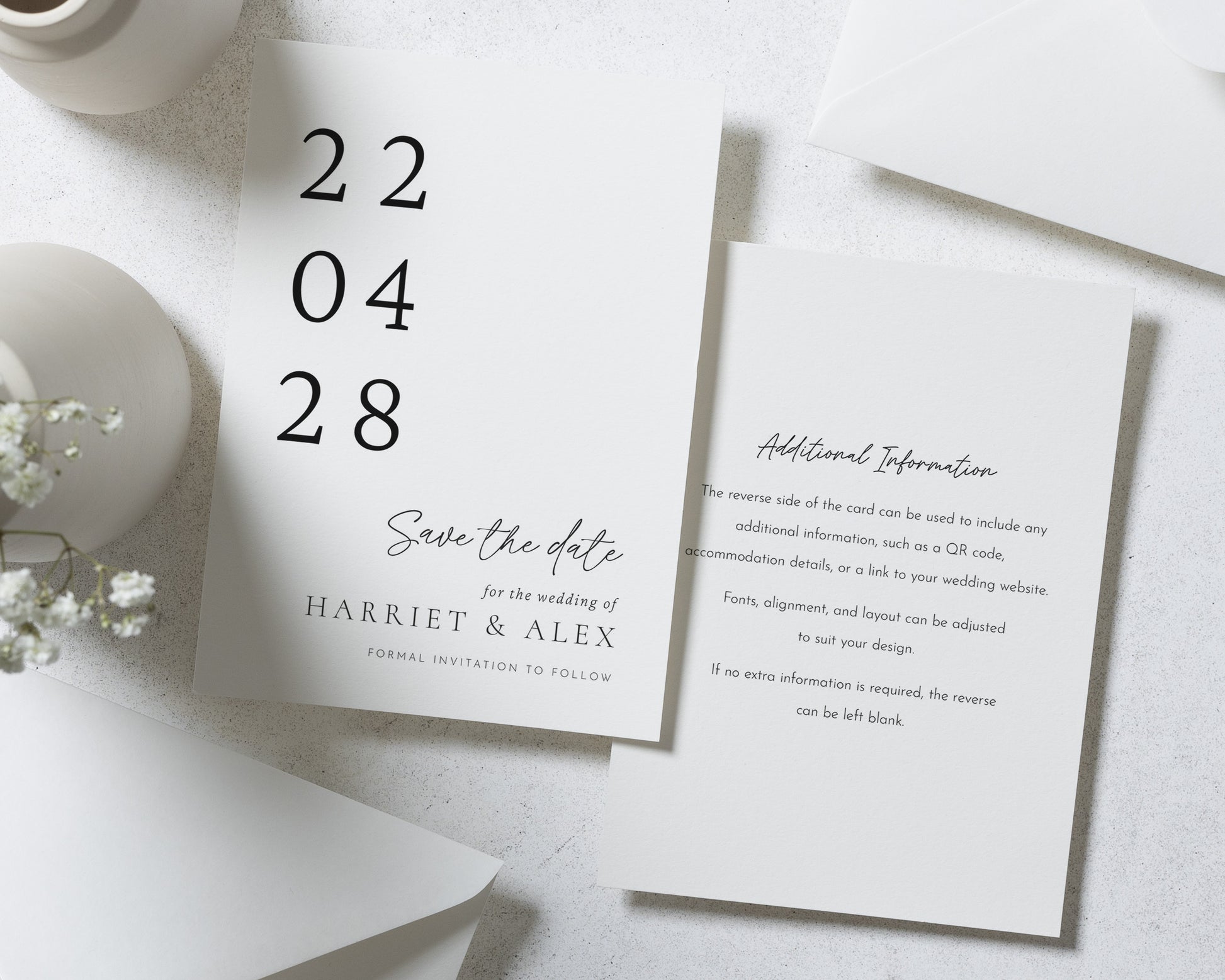 Announce your special day with this elegant, minimalist save the date card featuring bold date typography and personalised names. Perfect for modern weddings.