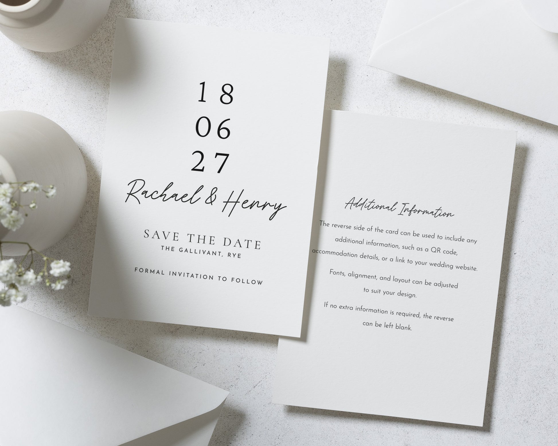 Announce your special day with this elegant, minimal save the date card featuring bold modern typography and your personalised details.