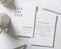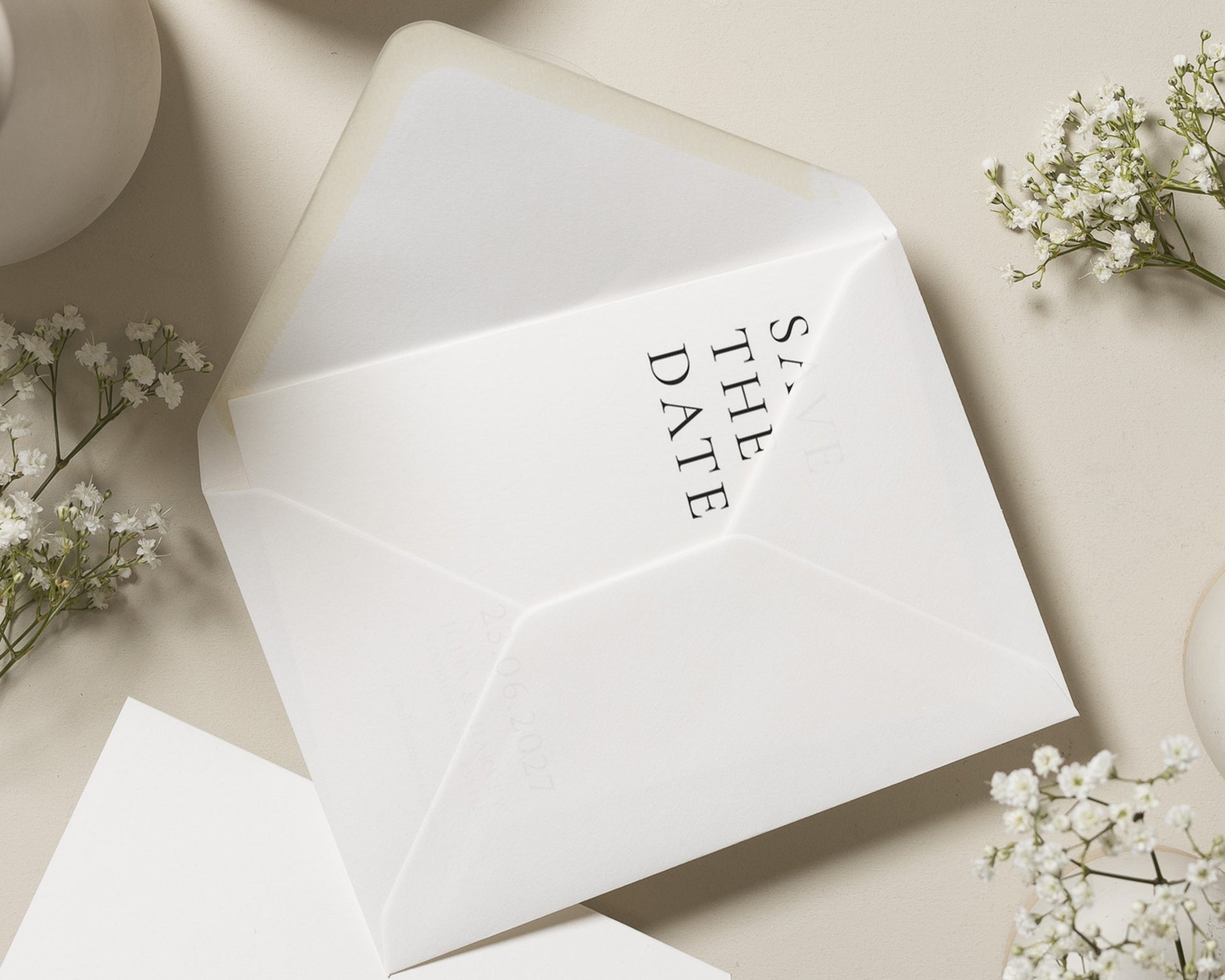 Announce your special day in style with this elegant, minimal Save the Date card. Personalised with your details for a timeless touch.