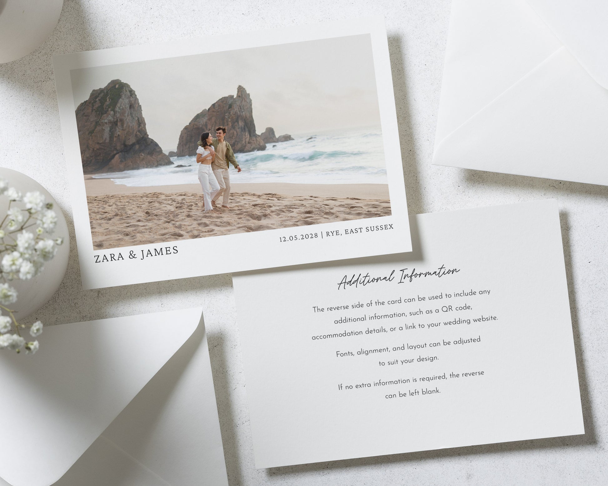 Announce your special day with this elegant, personalised photo save the date card. Featuring your favourite photo and modern minimalist text, it's the perfect way to share your wedding date with loved ones.