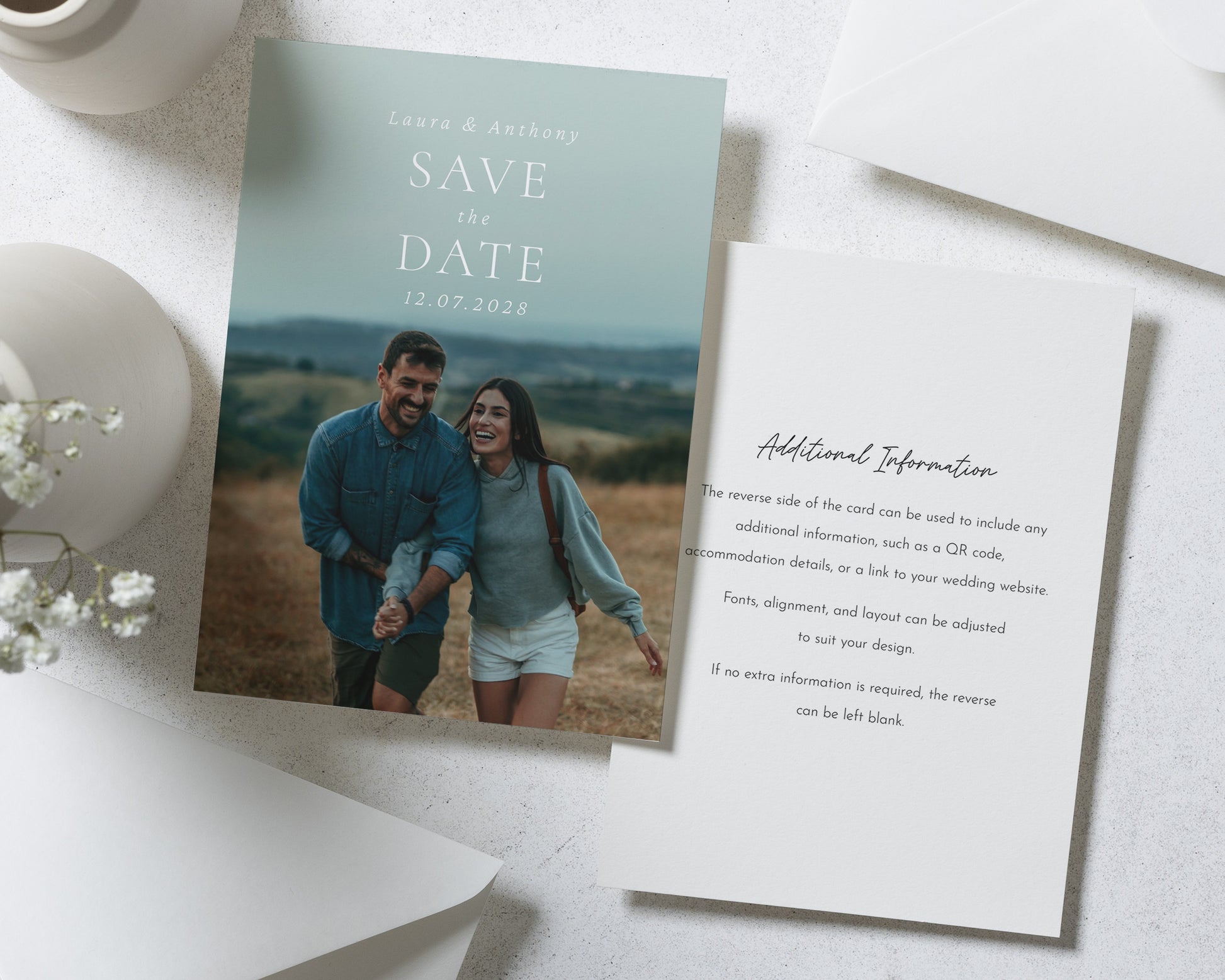 Our Save the Date cards are fully customisable – you can change all of the text to match your names, date, and wedding vibe. Whether you're planning a formal celebration or something more relaxed, we’ll help you create a design that feels uniquely you.