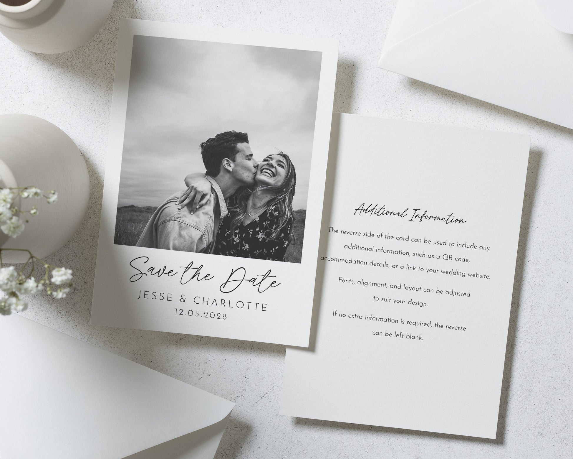 Showcase your favourite photo with this simple and modern personalised save the date card. Perfect for announcing your wedding in style.