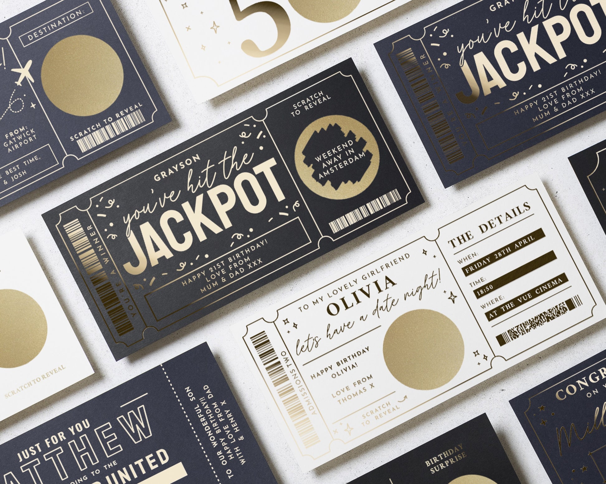 • Each voucher card measures 210x99mm, and is printed on heavyweight premium cardstock and finished with real gold foil detailing for a luxurious touch.