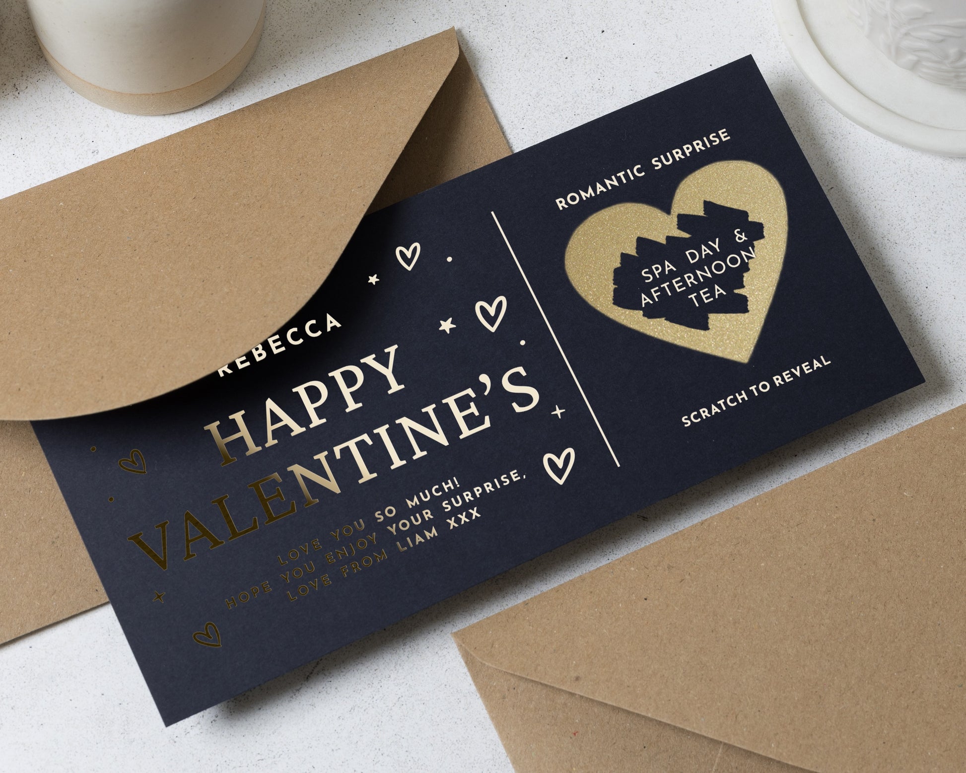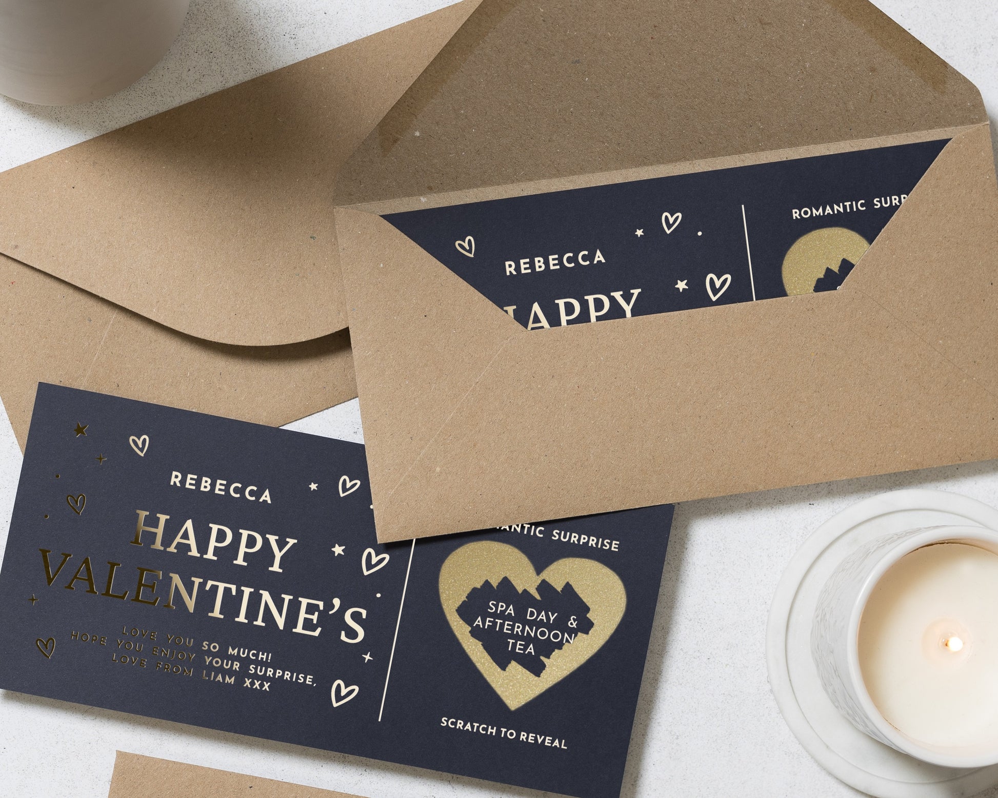 Surprise someone special with this personalised spa day and afternoon tea gift voucher, featuring elegant gold foil on a navy background and a scratch to reveal panel for a romantic Valentine's Day experience.