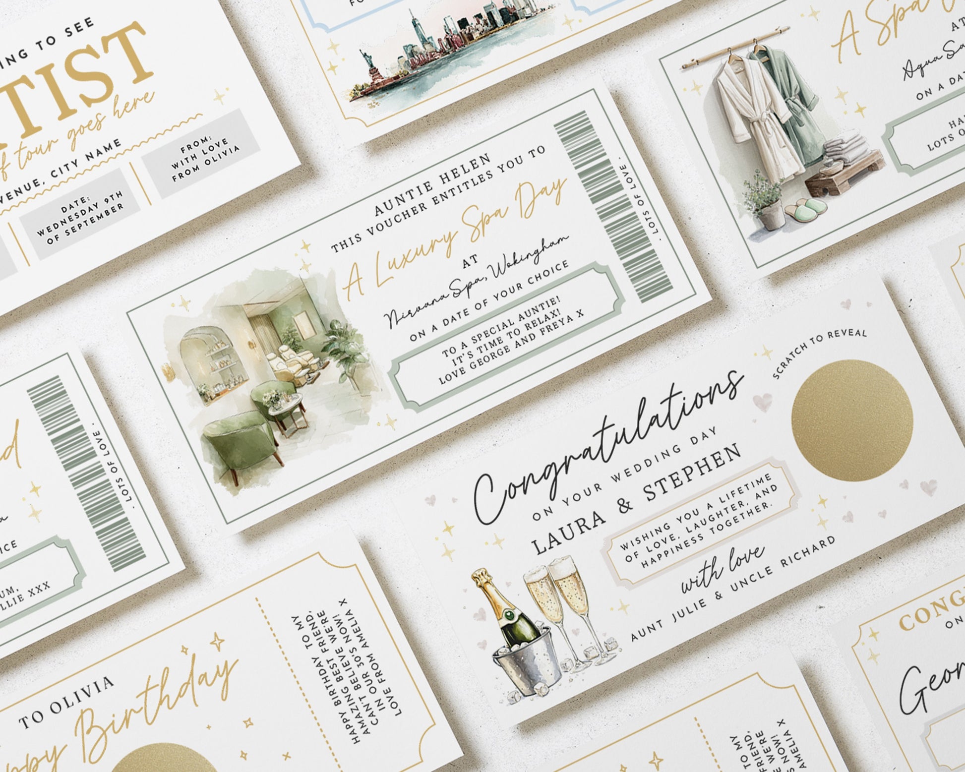 • Each voucher card measures 210x99mm, and is printed on heavyweight premium cardstock.