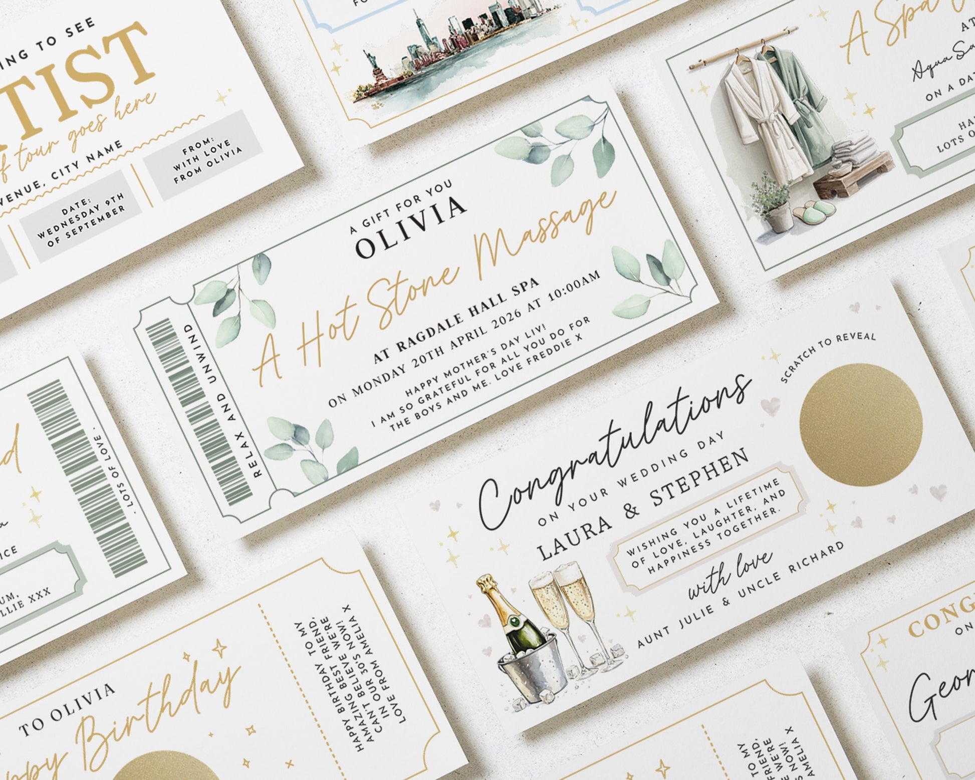 • Each voucher card measures 210x99mm, and is printed on heavyweight premium cardstock.