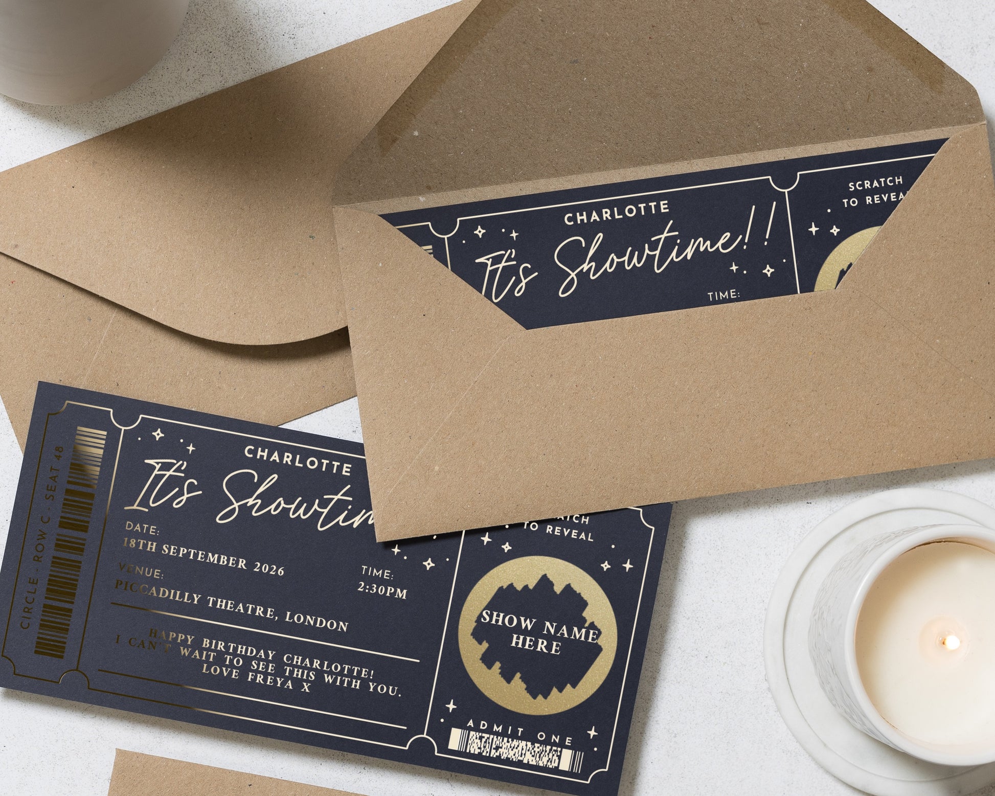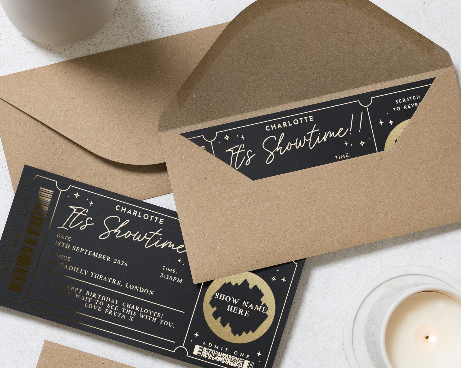 Surprise someone special with a personalised gold foil theatre ticket gift voucher. Scratch to reveal the show name for a magical birthday experience.