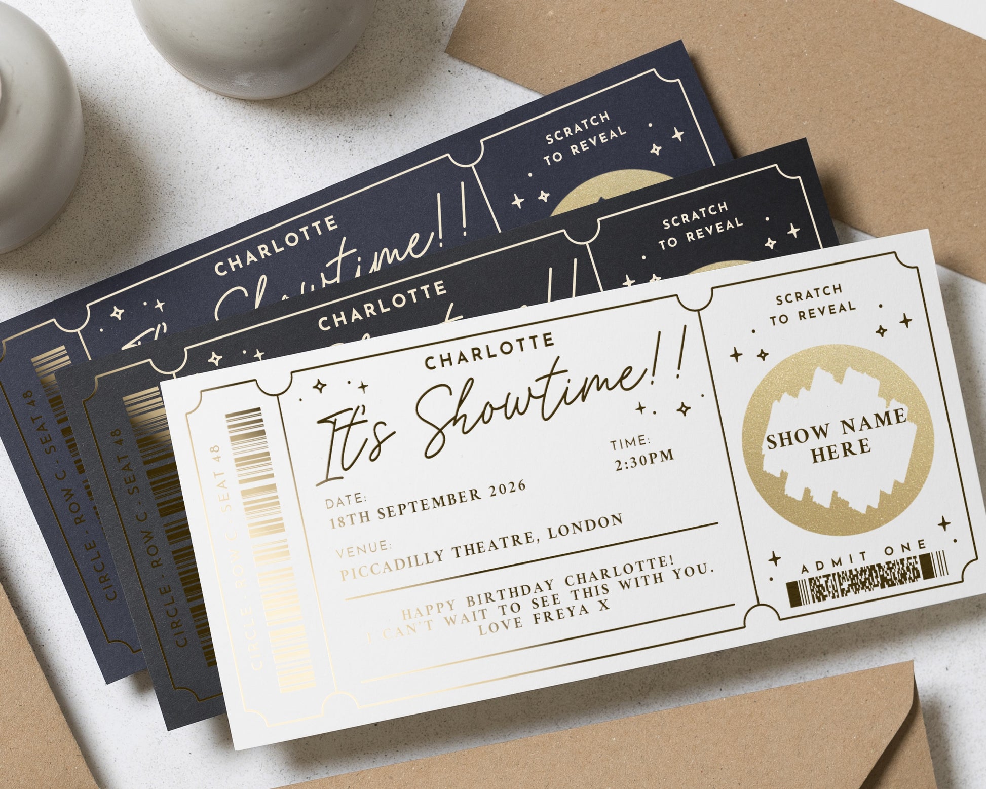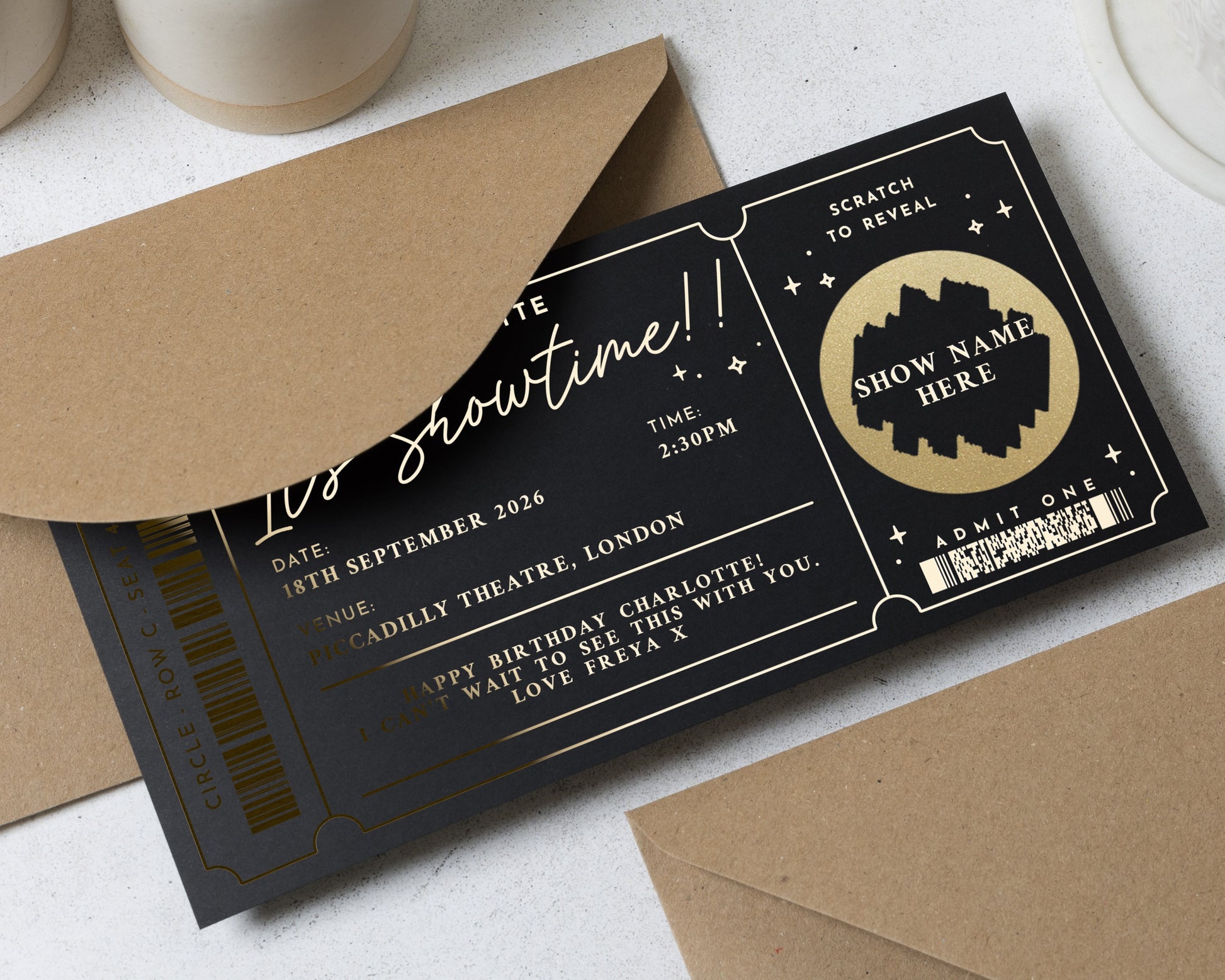 Personalised Theatre Ticket Gift, Scratch To Reveal Show, Birthday Gift For Her, Gold Foil Gift Voucher, Custom Theatre Experience