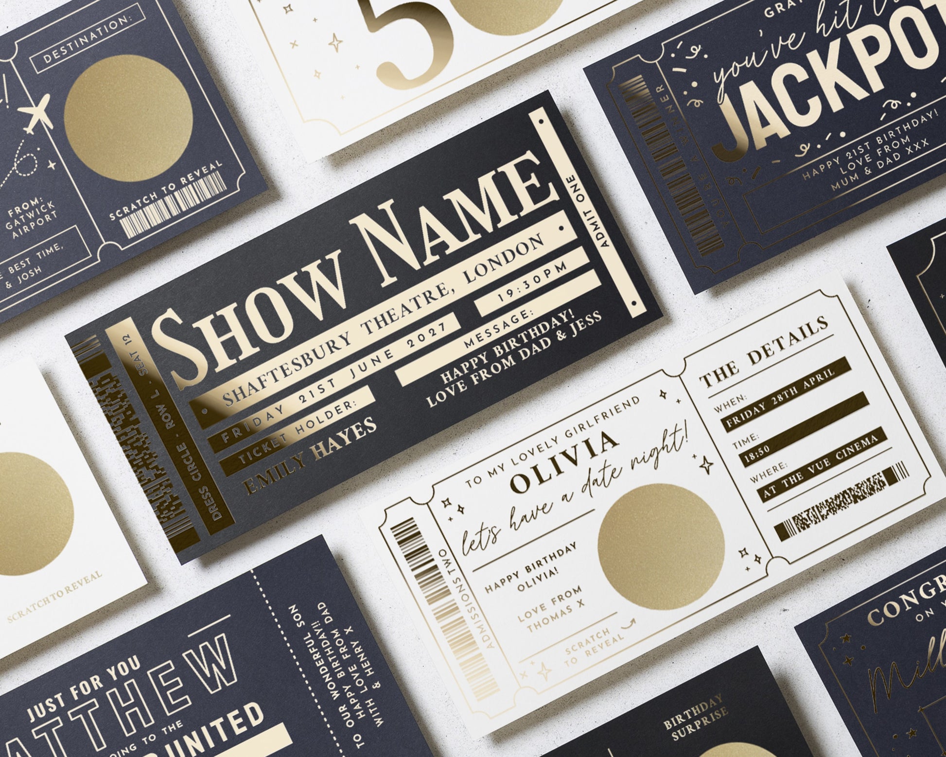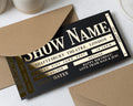 Surprise someone special with a personalised gold foil theatre ticket gift voucher. Perfect for birthdays or special occasions, this custom ticket is designed in a striking black and gold style for a true showstopper moment.