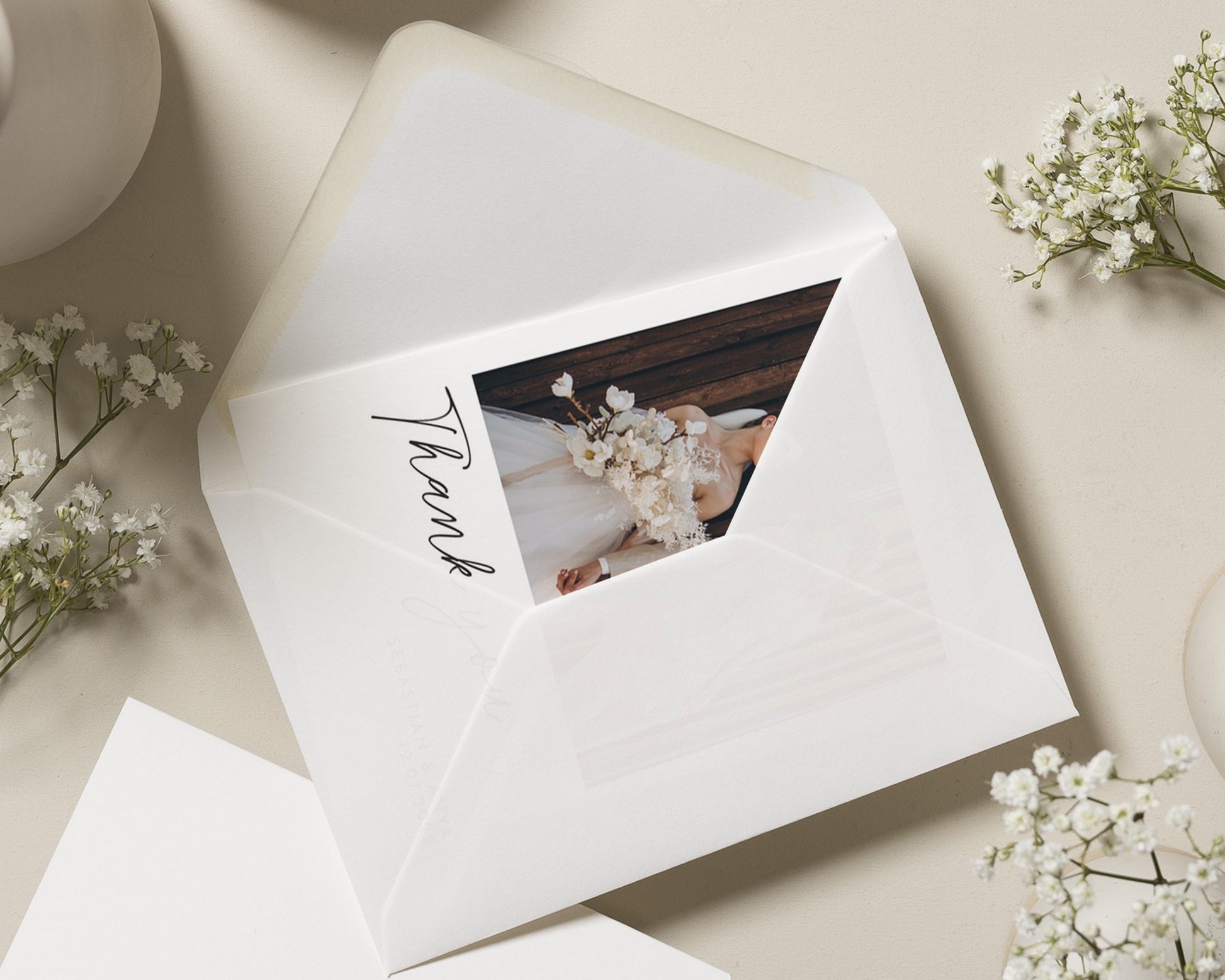 Our wedding thank you cards are fully personalised – featuring your chosen photo (or photos!) and wording to match your style. Whether you prefer something modern and minimal or a design with a touch of elegance, we’ll help you create a card that feels uniquely you.