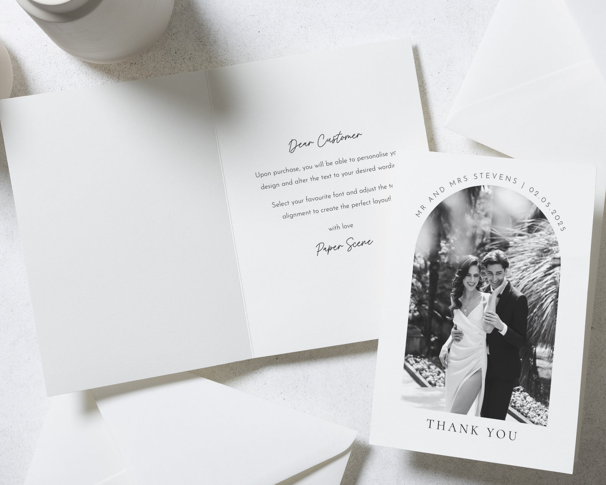 Our wedding thank you cards are fully personalised – featuring your chosen photo (or photos!) and wording to match your style. Whether you prefer something modern and minimal or a design with a touch of elegance, we’ll help you create a card that feels uniquely you.