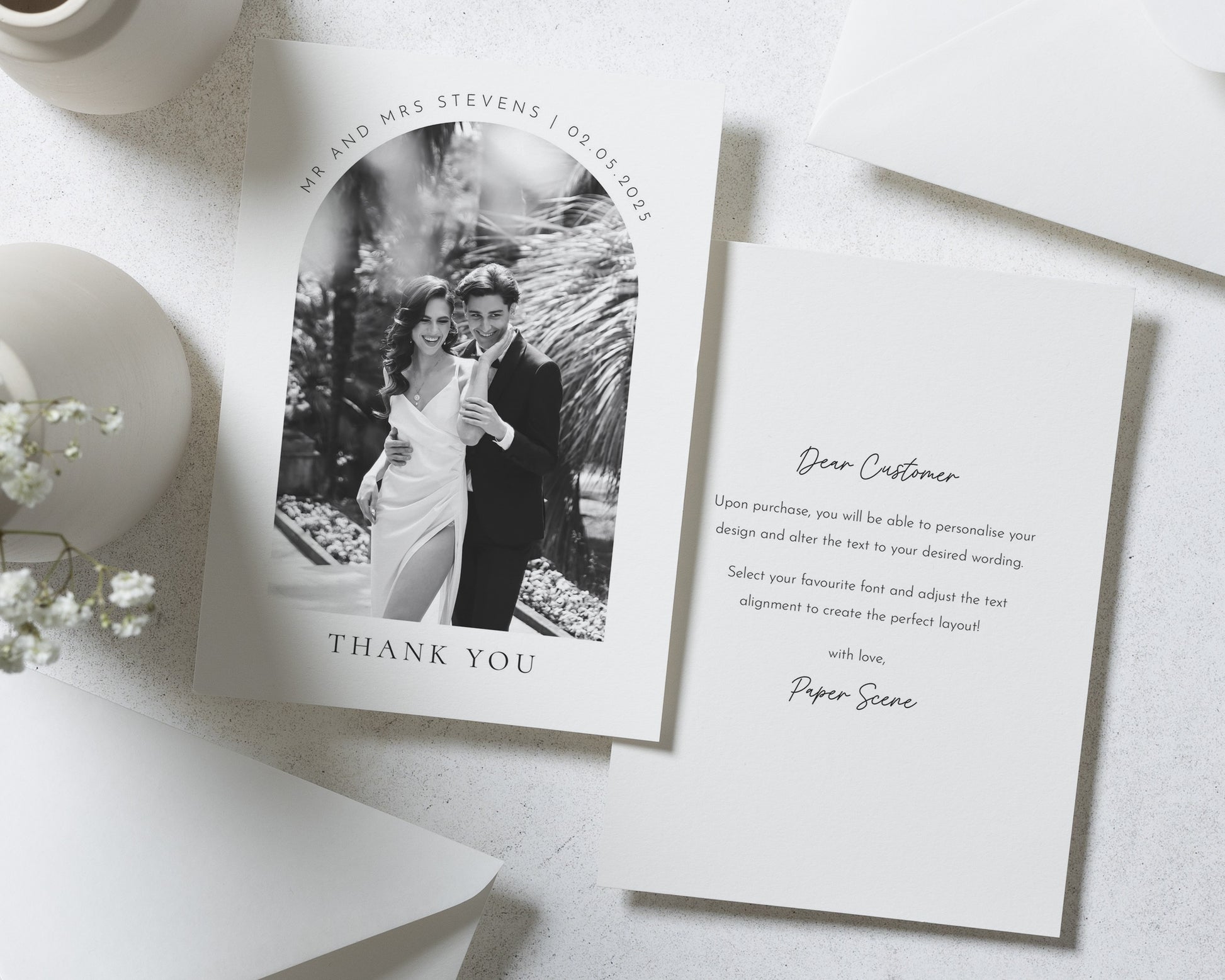 A beautifully minimalist wedding thank you card featuring your favourite photo and custom names and date. Perfect for sharing your gratitude in style.