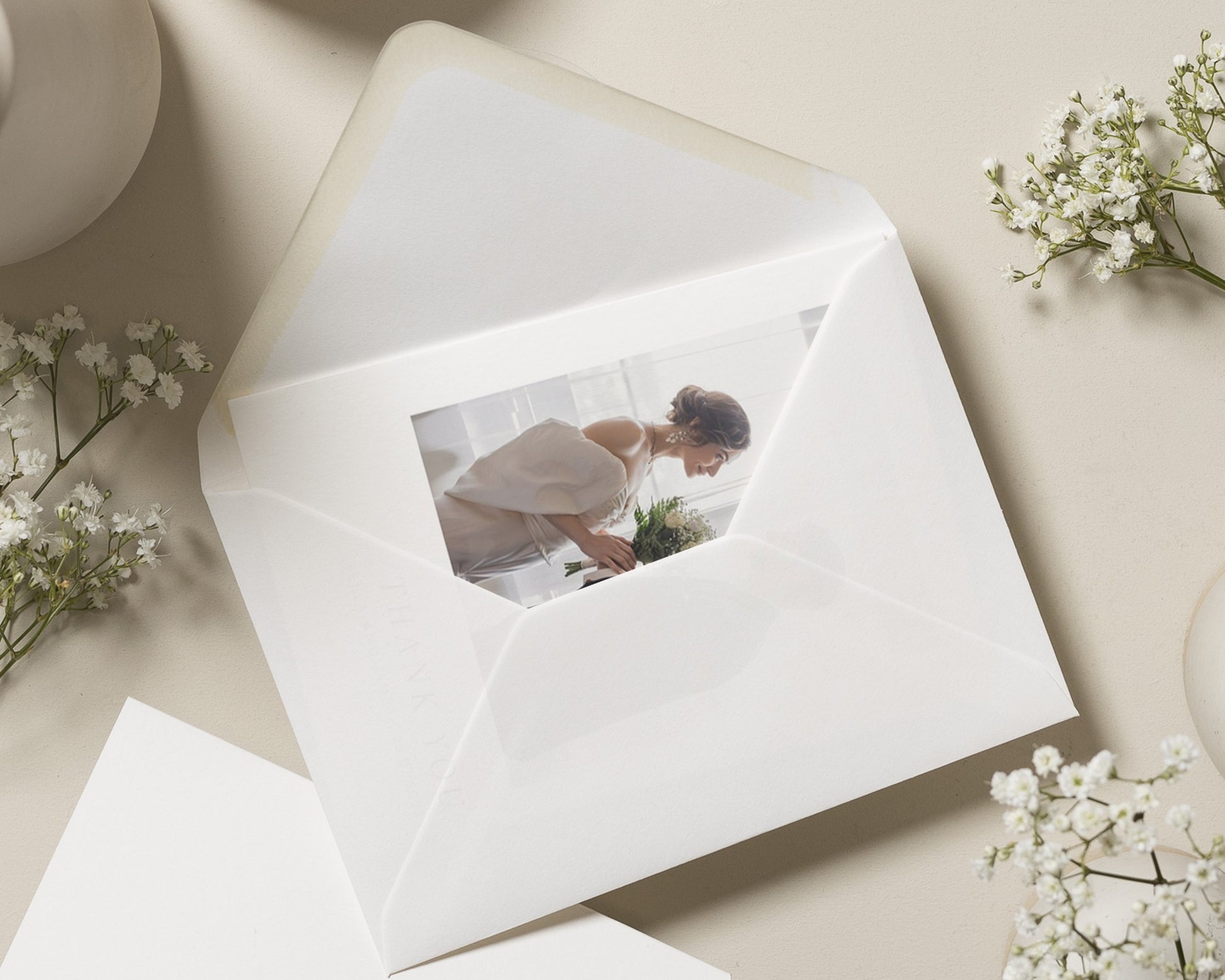 Every order includes premium heavyweight white envelopes with a diamond flap.