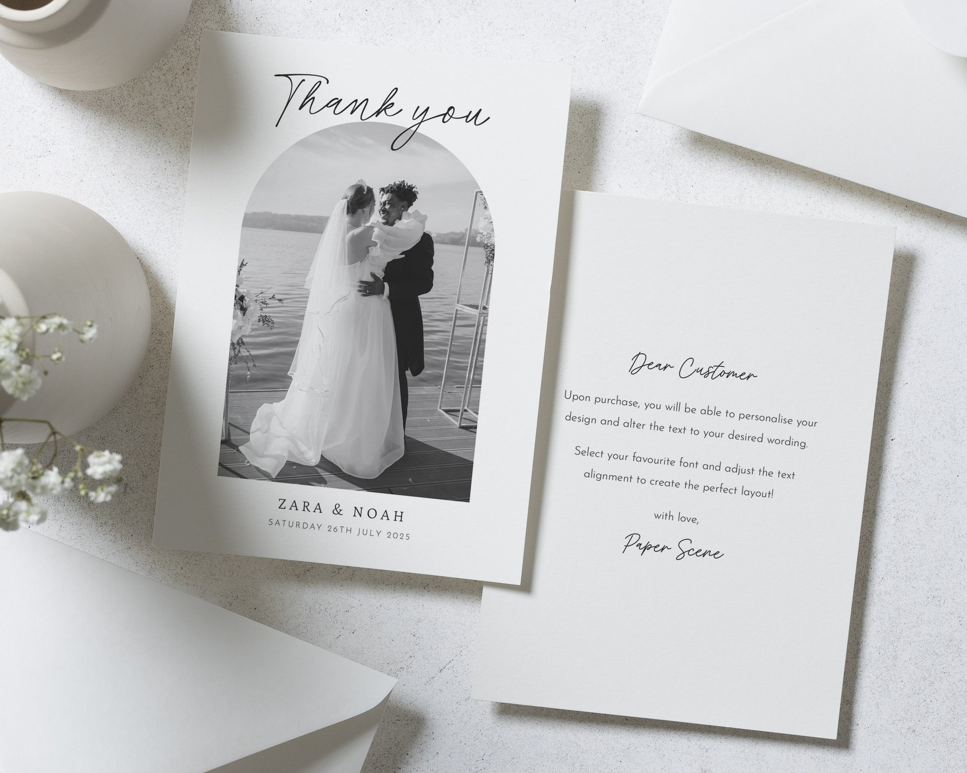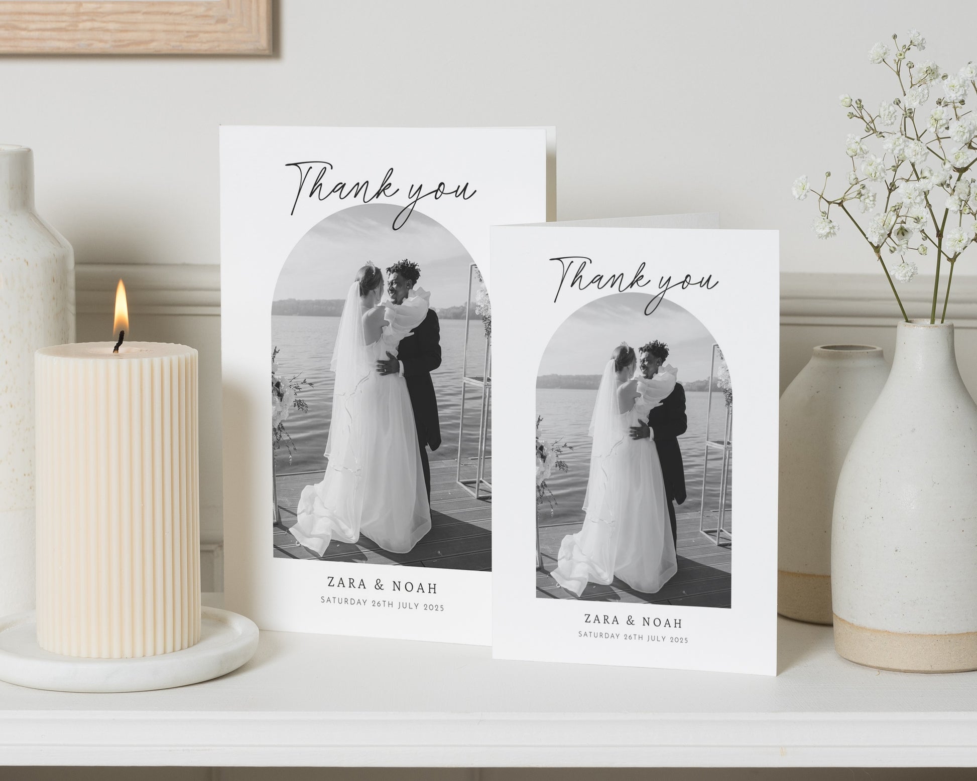 Our wedding thank you cards are fully personalised – featuring your chosen photo (or photos!) and wording to match your style. Whether you prefer something modern and minimal or a design with a touch of elegance, we’ll help you create a card that feels uniquely you.