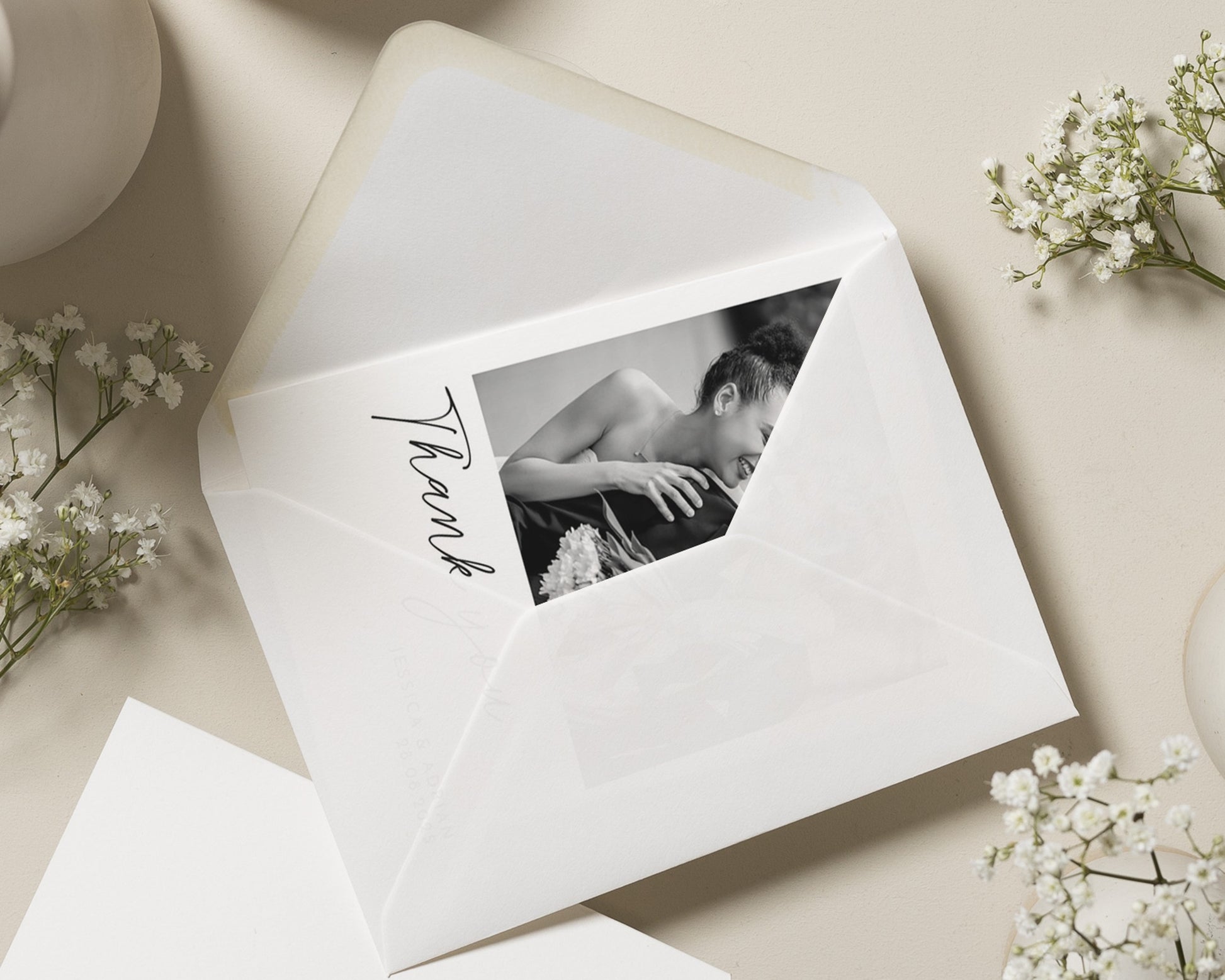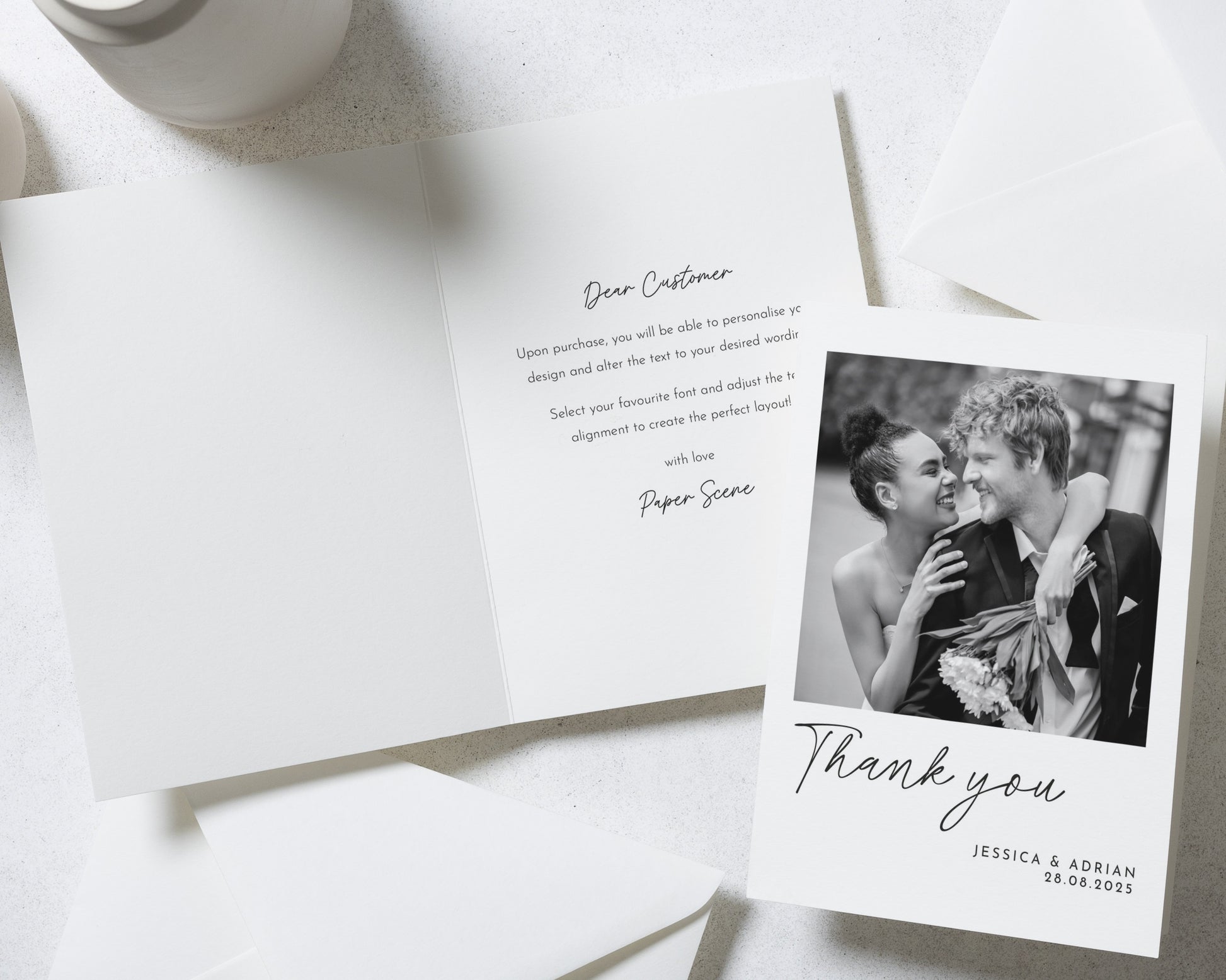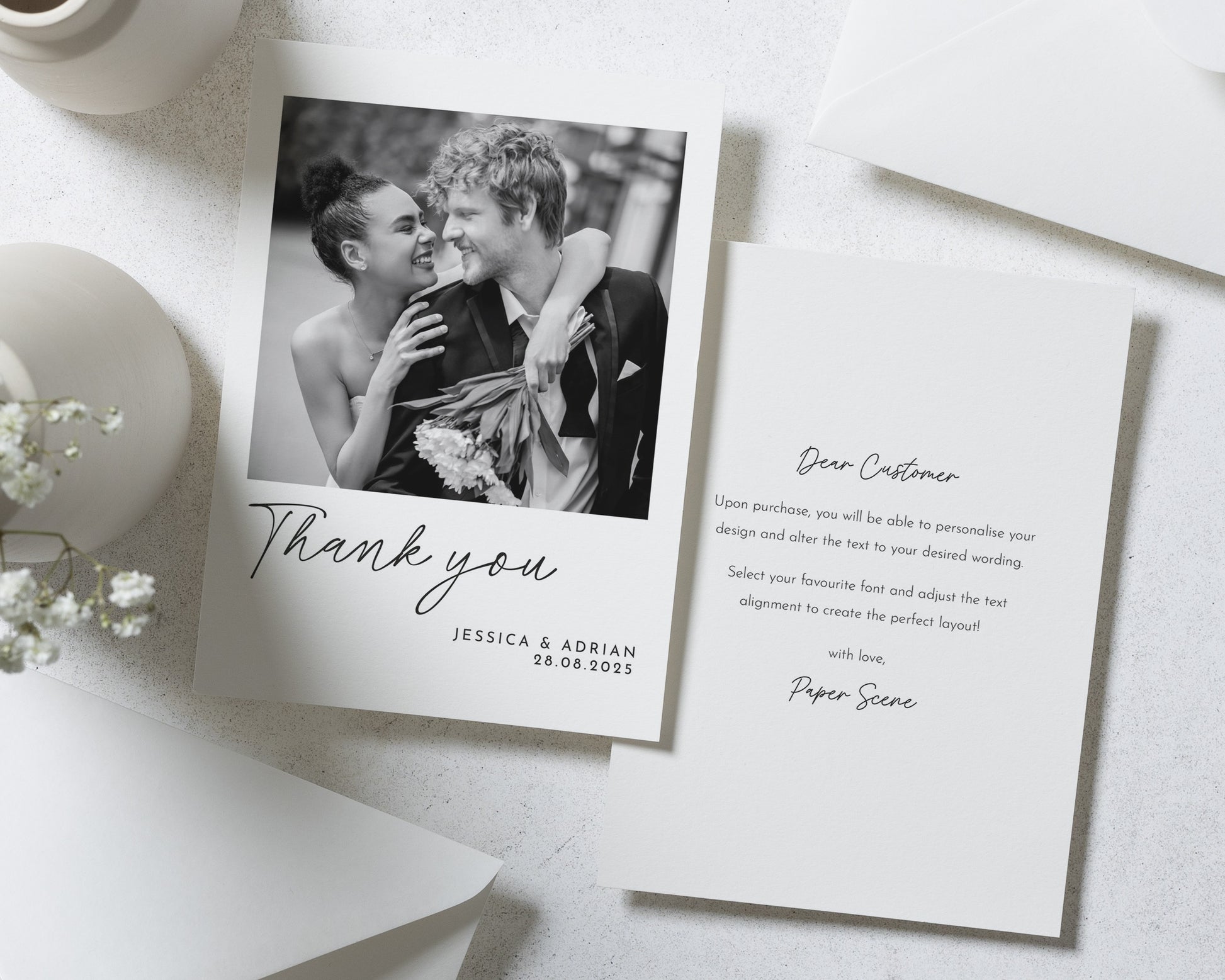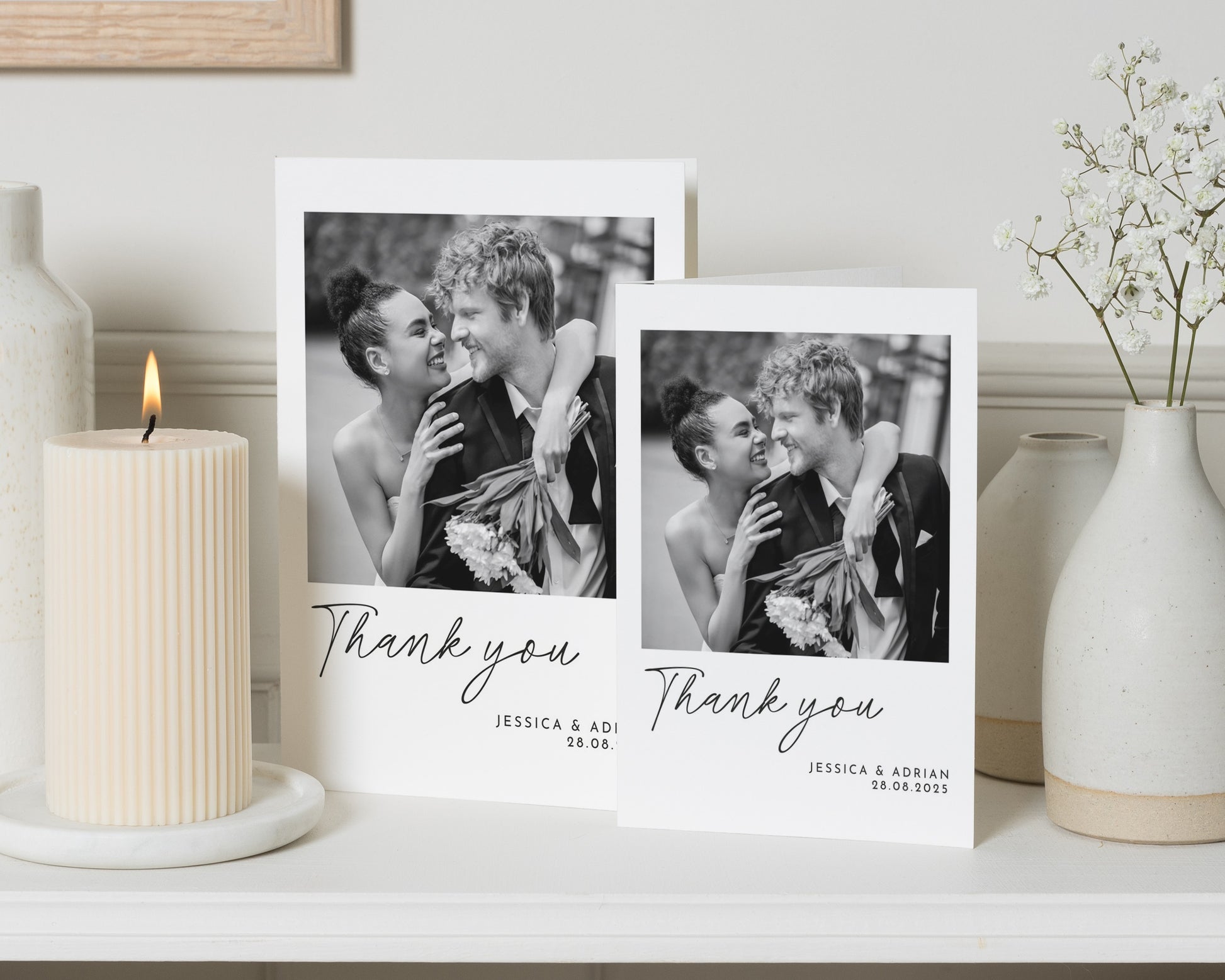 Our wedding thank you cards are fully personalised – featuring your chosen photo (or photos!) and wording to match your style. Whether you prefer something modern and minimal or a design with a touch of elegance, we’ll help you create a card that feels uniquely you.