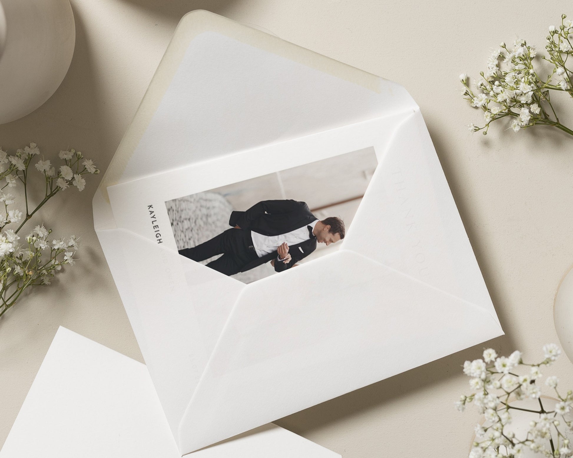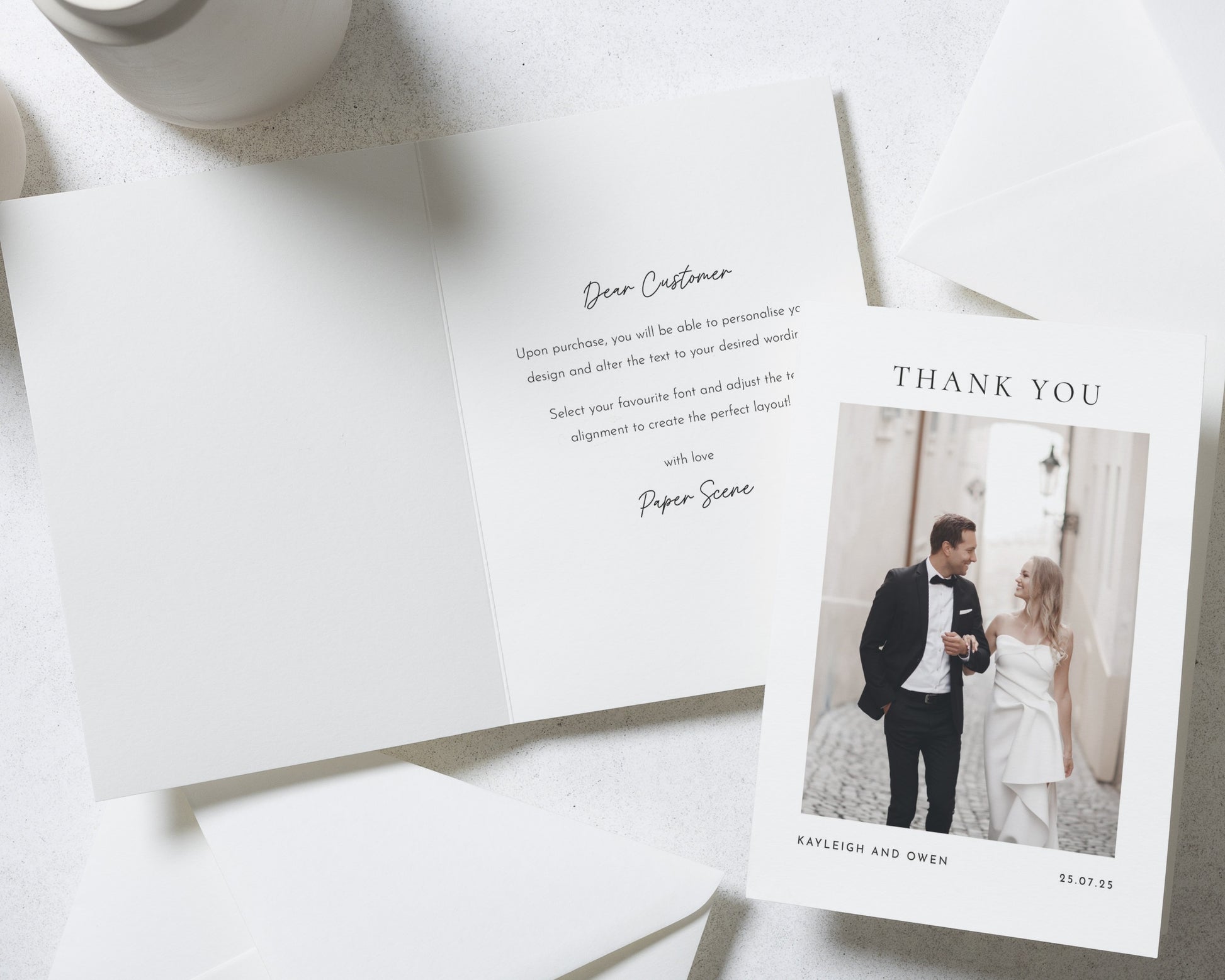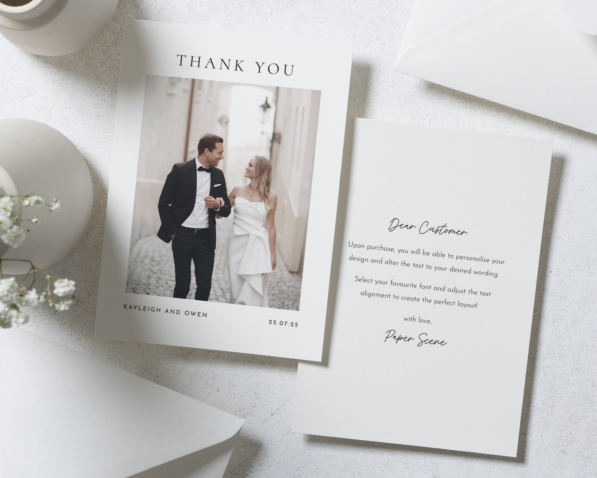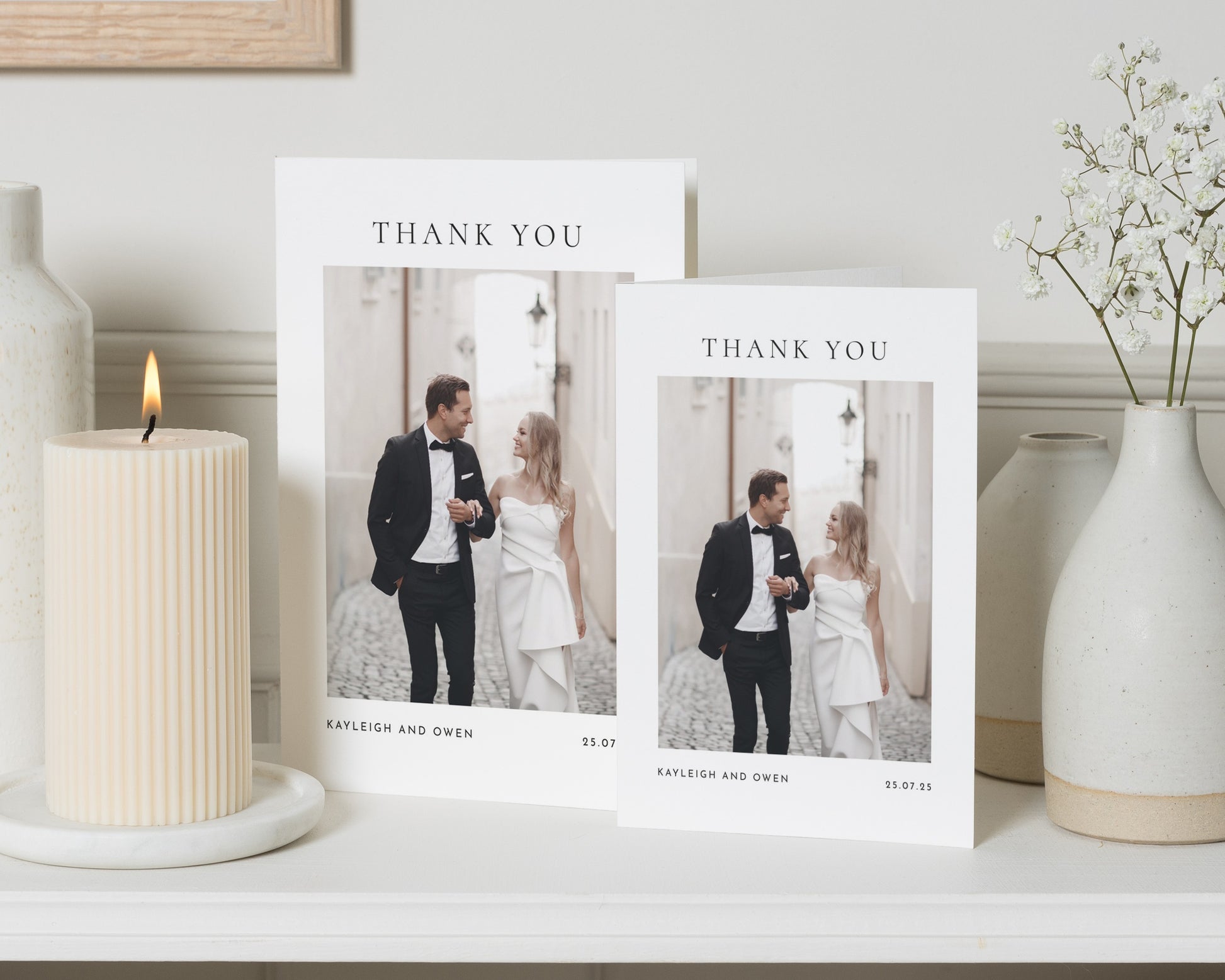 Our wedding thank you cards are fully personalised – featuring your chosen photo (or photos!) and wording to match your style. Whether you prefer something modern and minimal or a design with a touch of elegance, we’ll help you create a card that feels uniquely you.