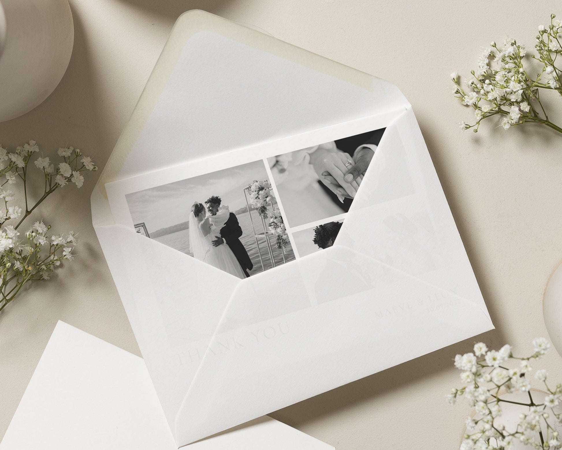 Our wedding thank you cards are fully personalised – featuring your chosen photo (or photos!) and wording to match your style. Whether you prefer something modern and minimal or a design with a touch of elegance, we’ll help you create a card that feels uniquely you.