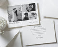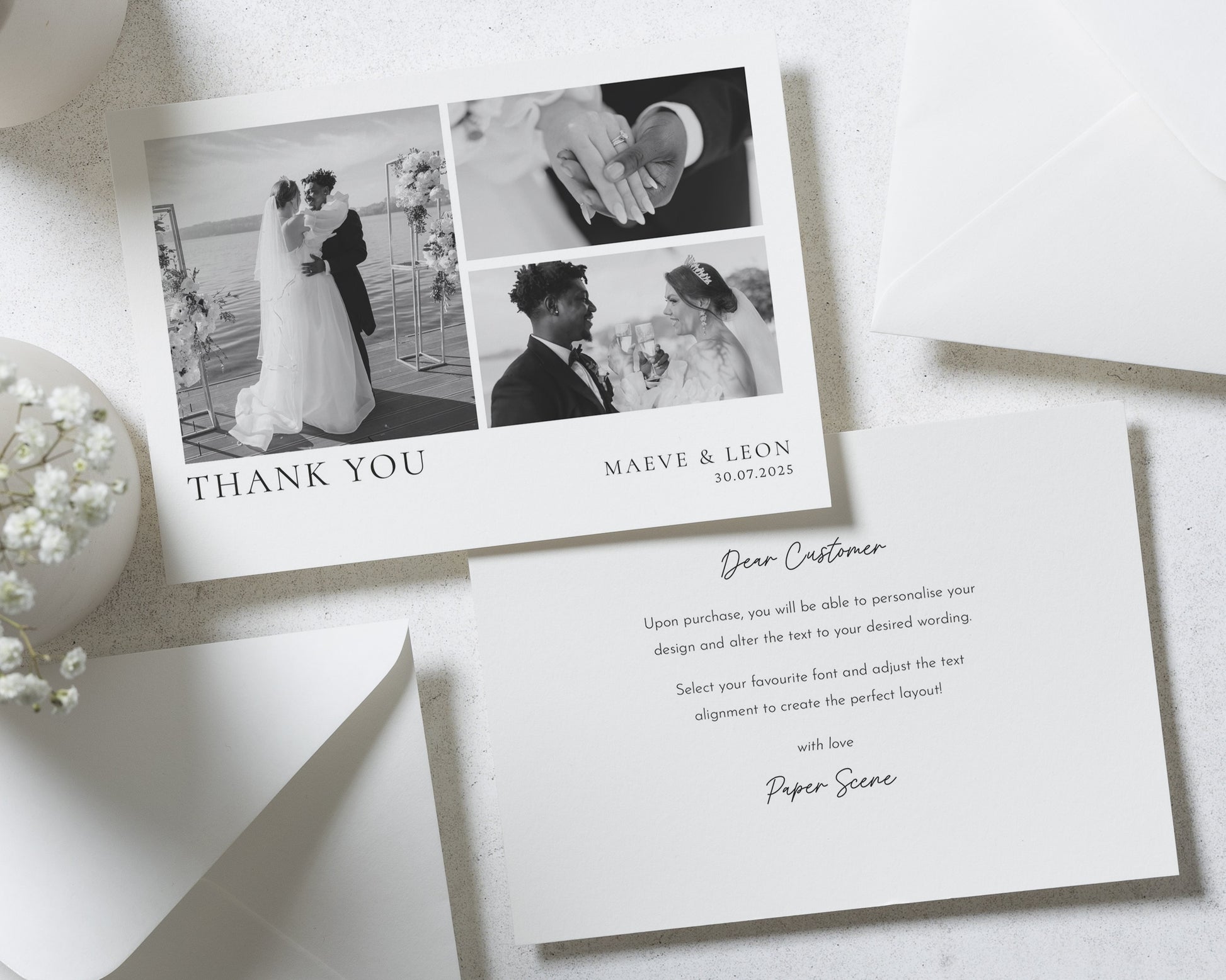 This elegant personalised wedding thank you card features a modern collage layout for your favourite wedding photos, with names and date customisation.