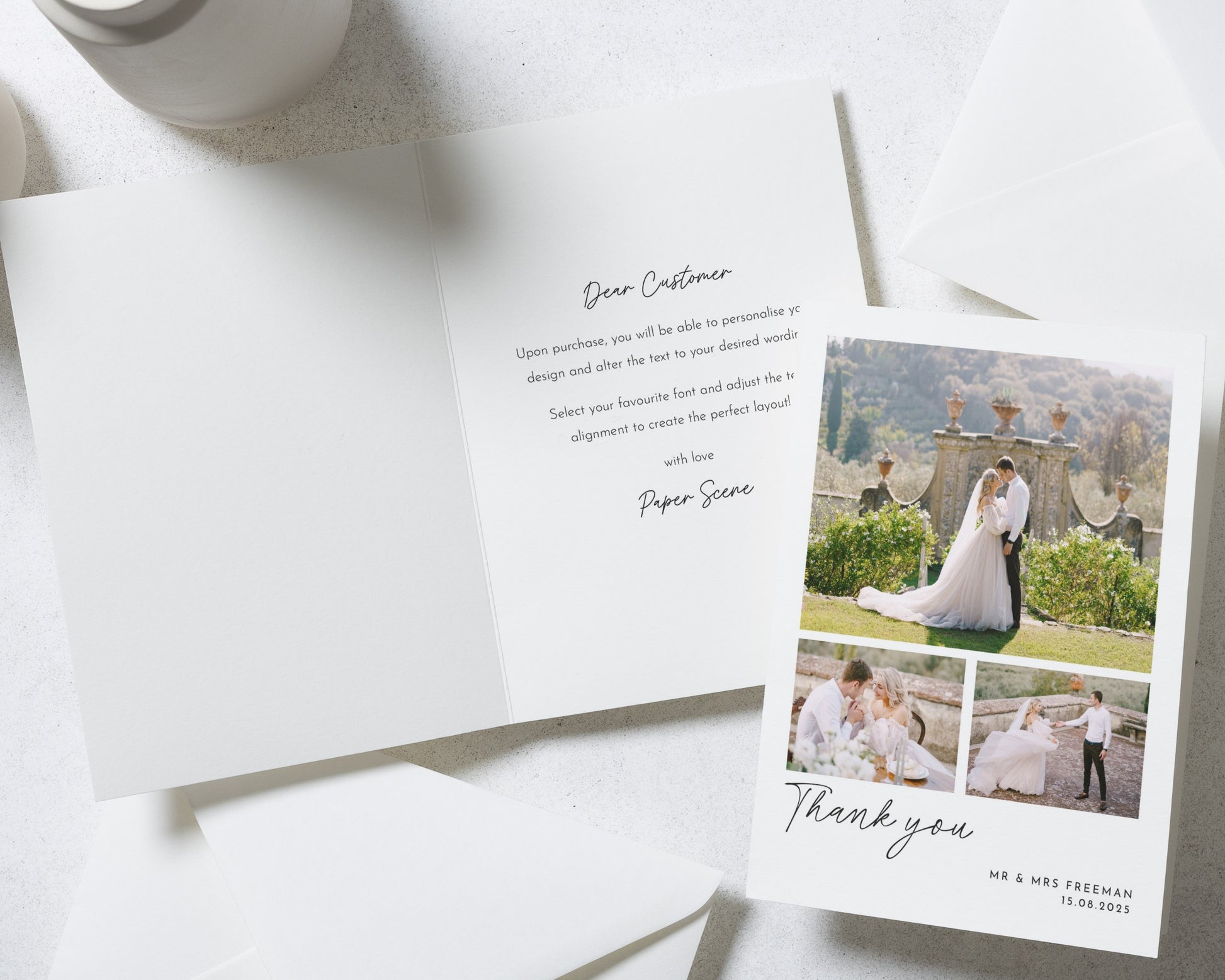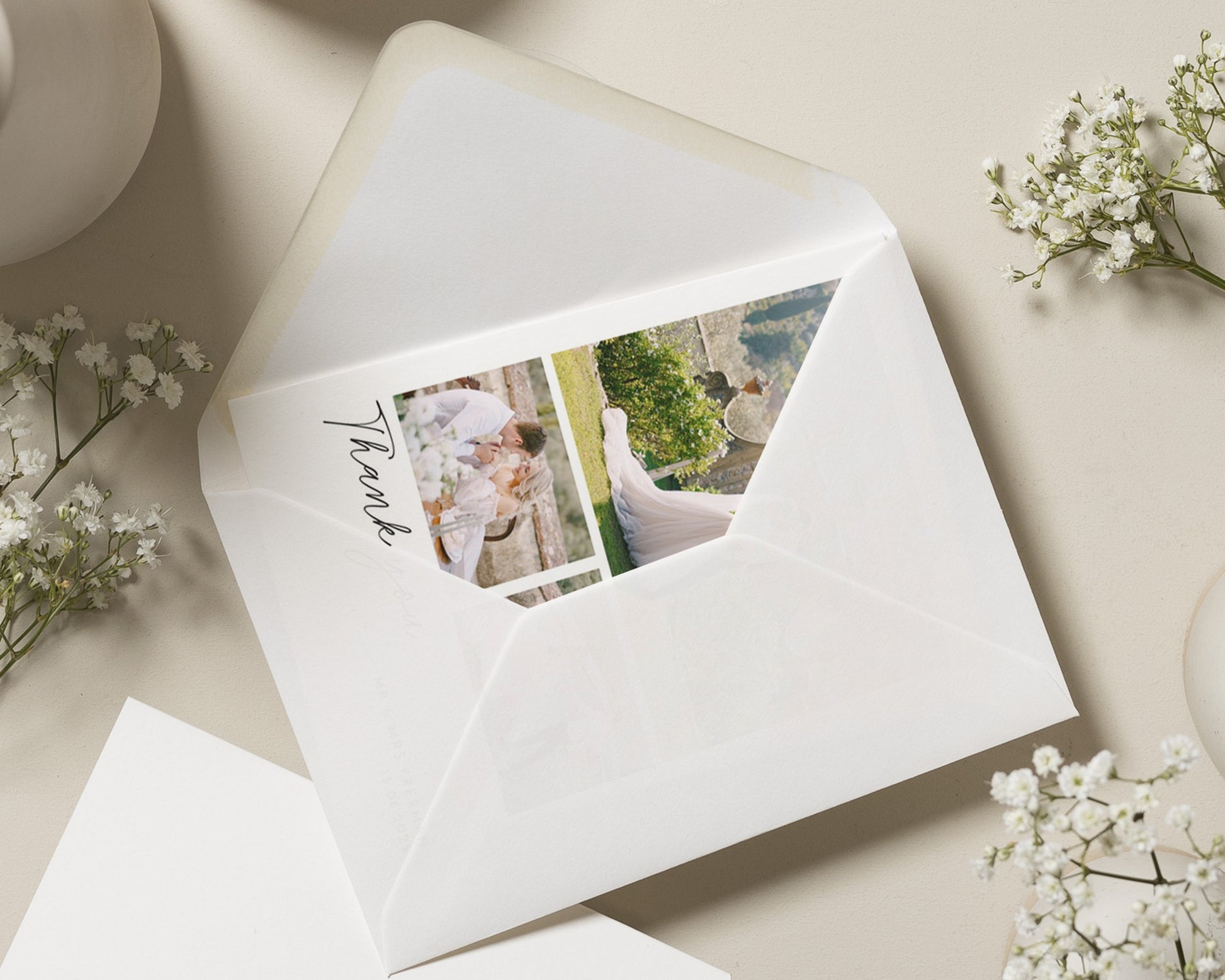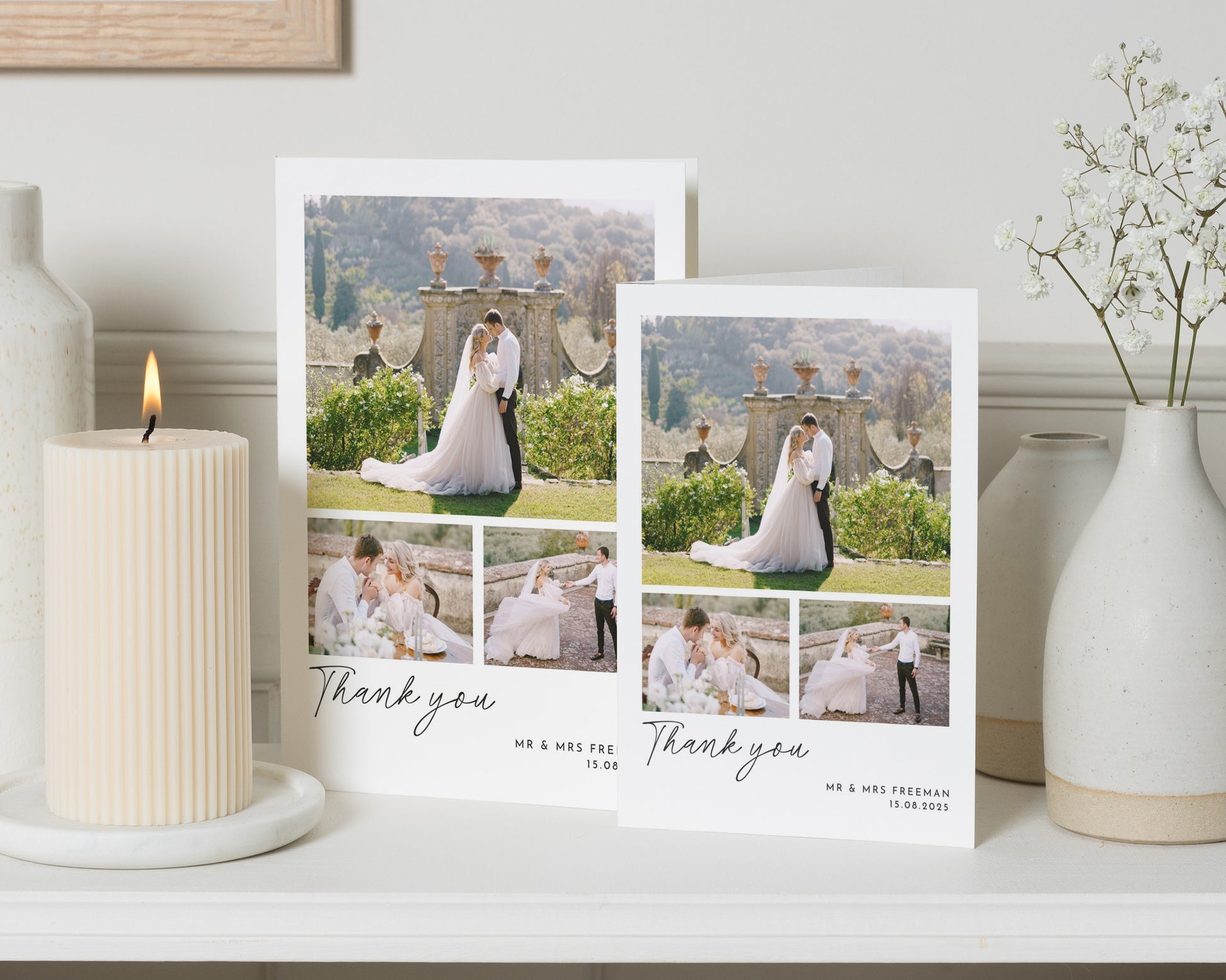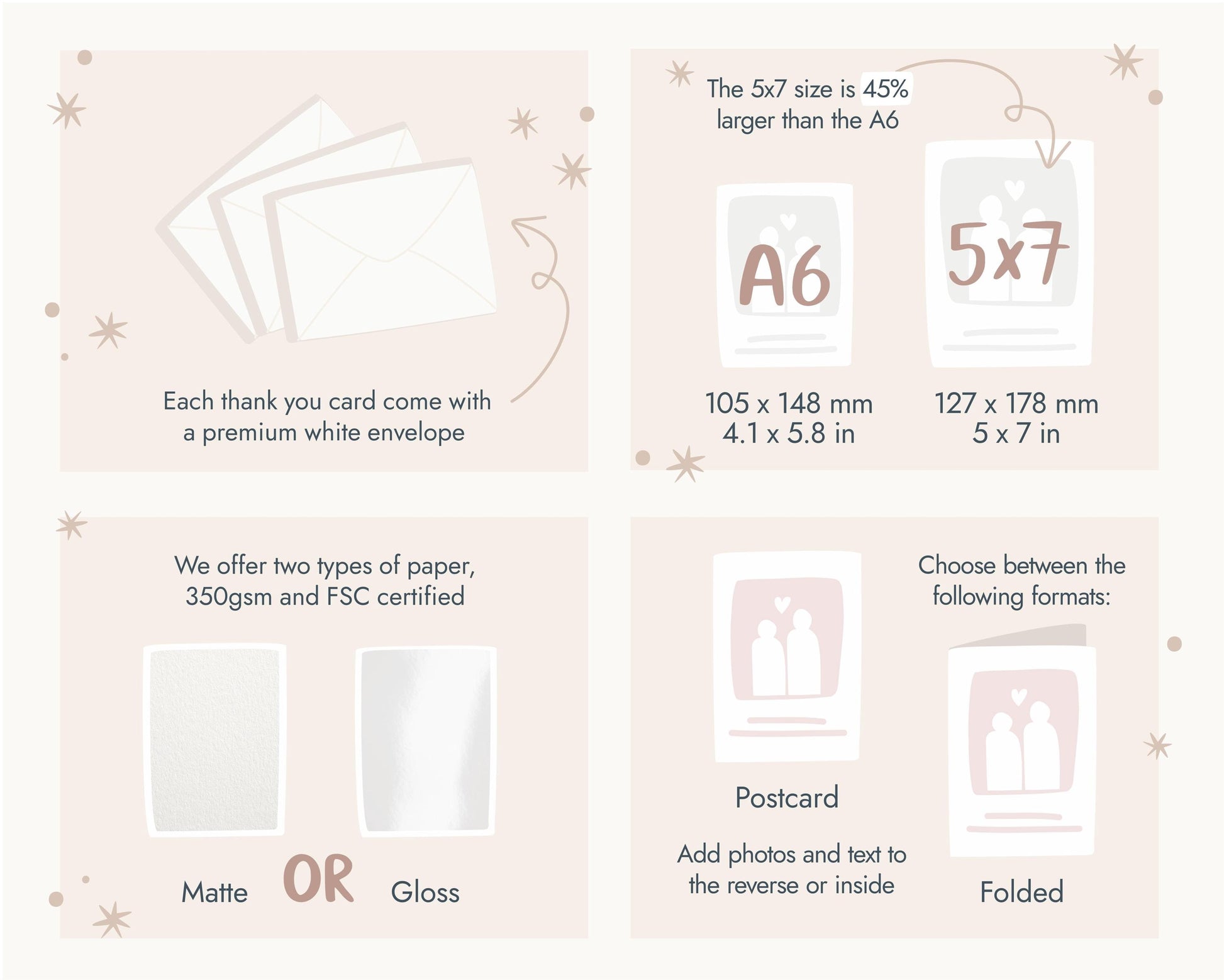 Our wedding thank you cards are fully personalised – featuring your chosen photo (or photos!) and wording to match your style. Whether you prefer something modern and minimal or a design with a touch of elegance, we’ll help you create a card that feels uniquely you.