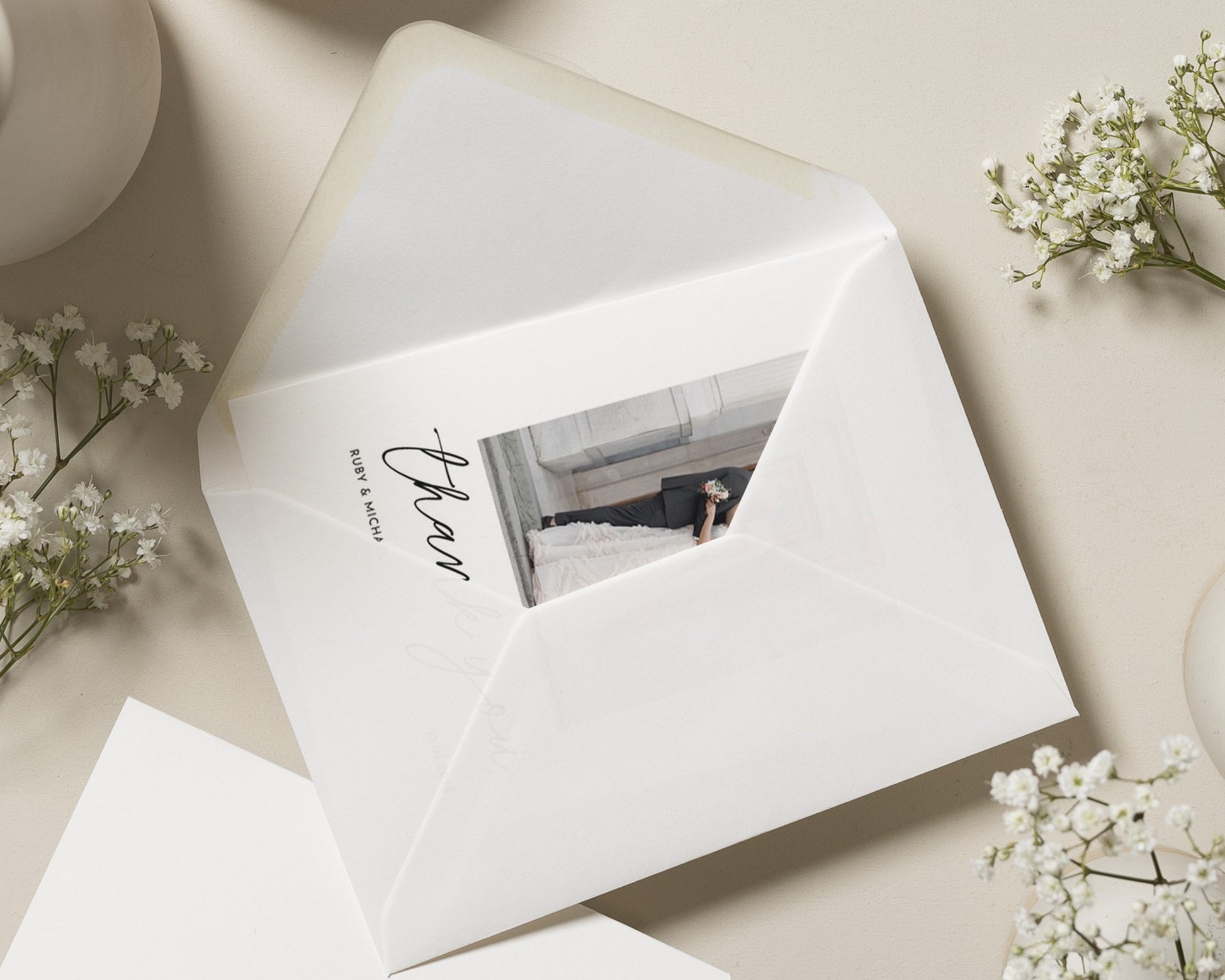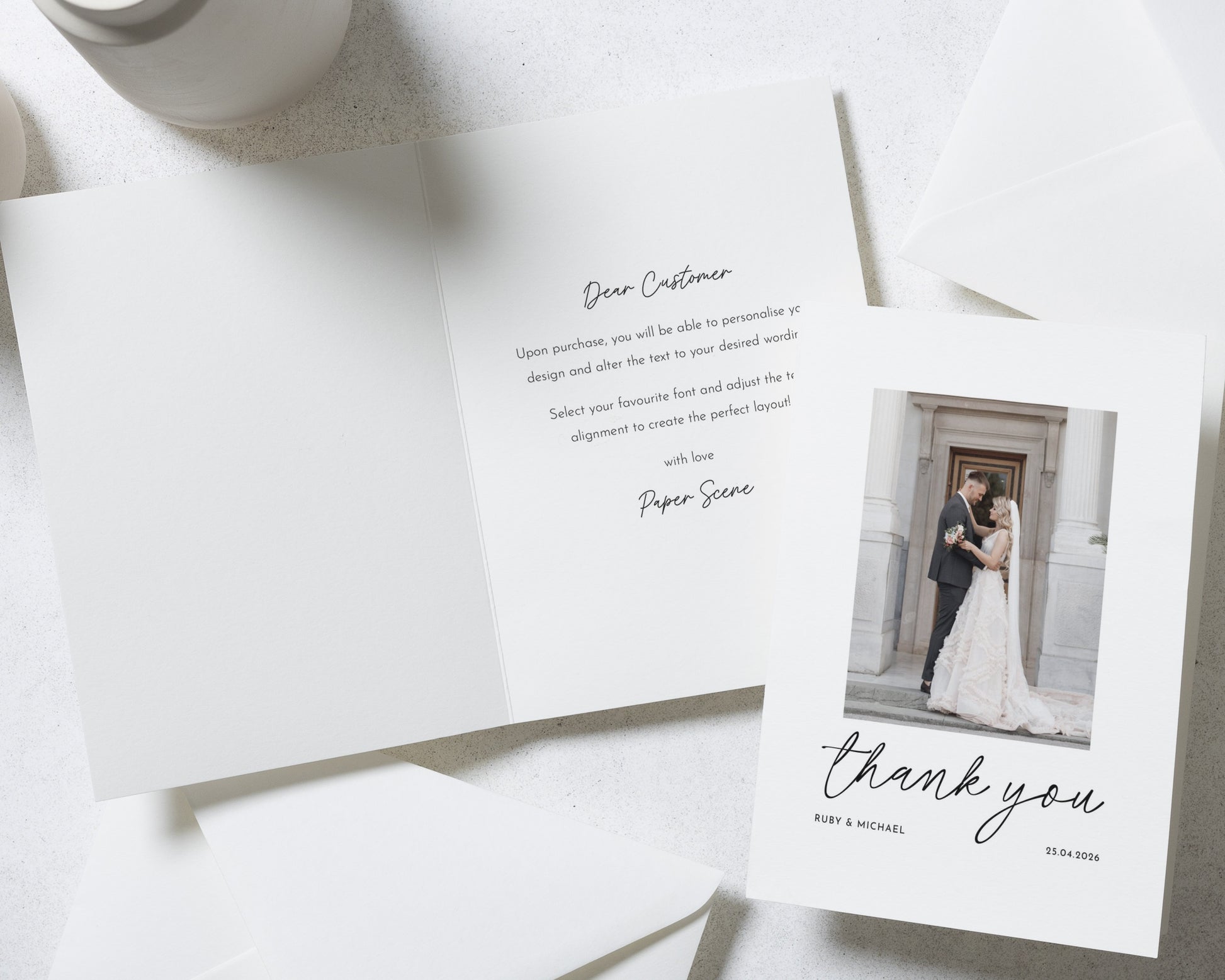 Our wedding thank you cards are fully personalised – featuring your chosen photo (or photos!) and wording to match your style. Whether you prefer something modern and minimal or a design with a touch of elegance, we’ll help you create a card that feels uniquely you.
