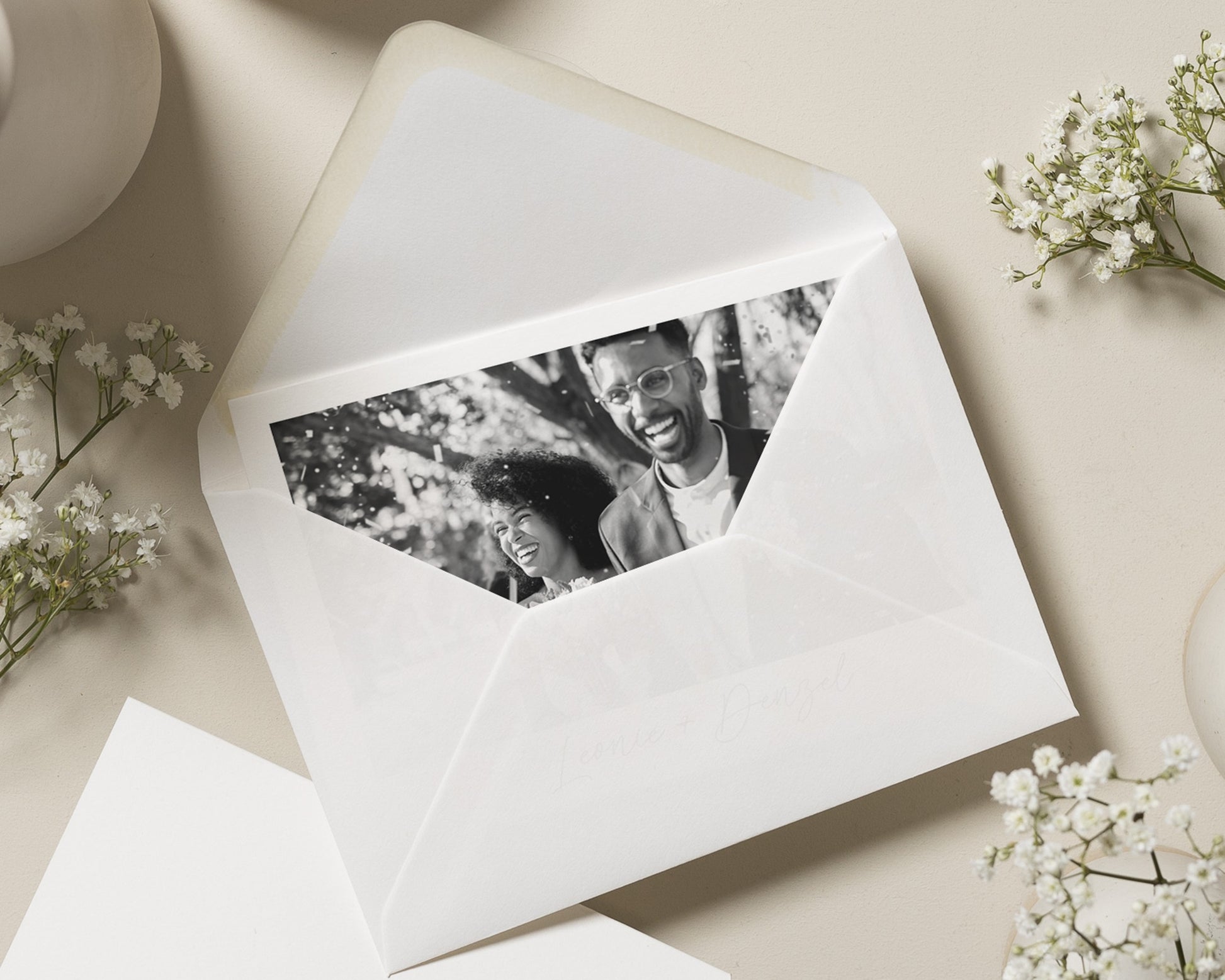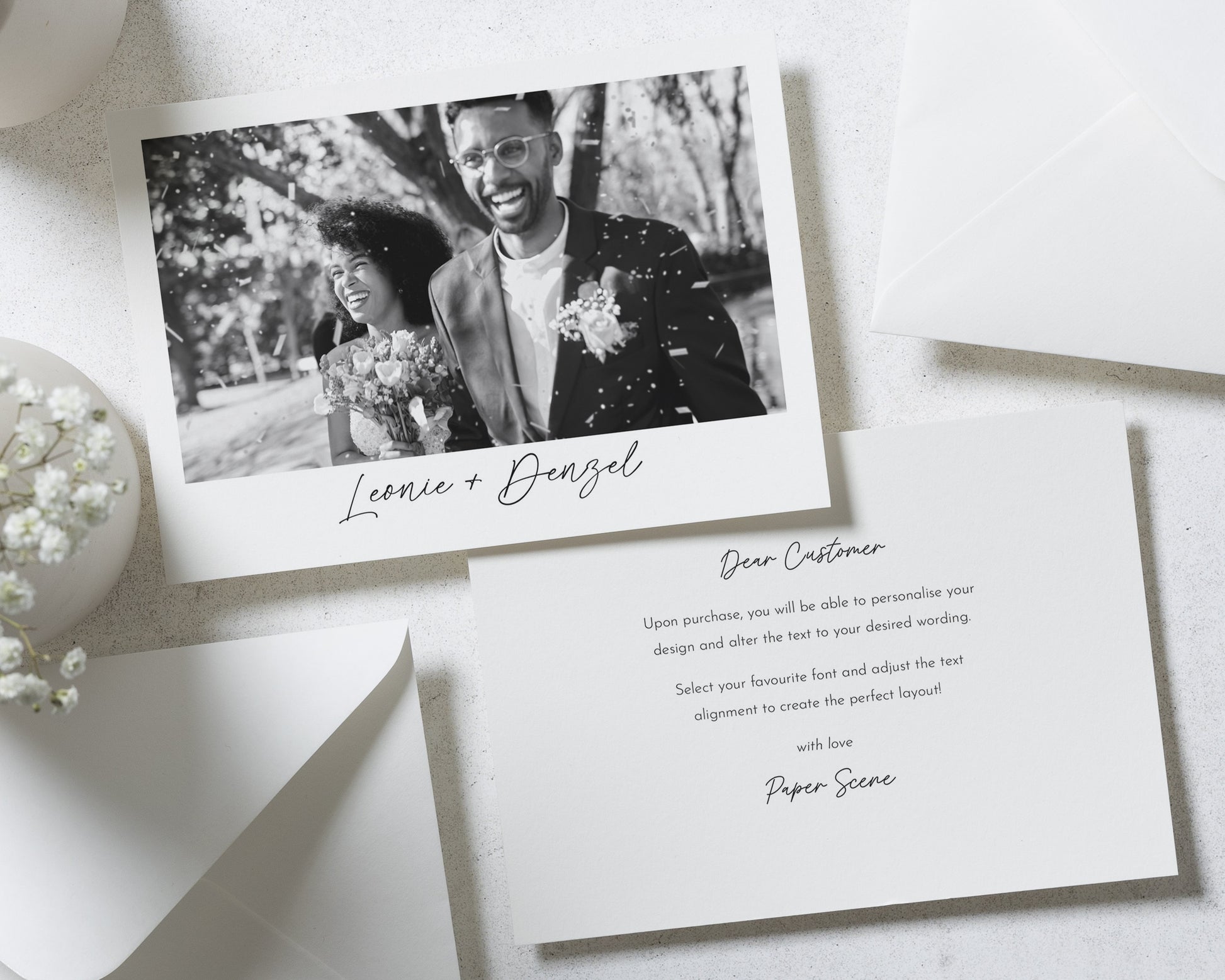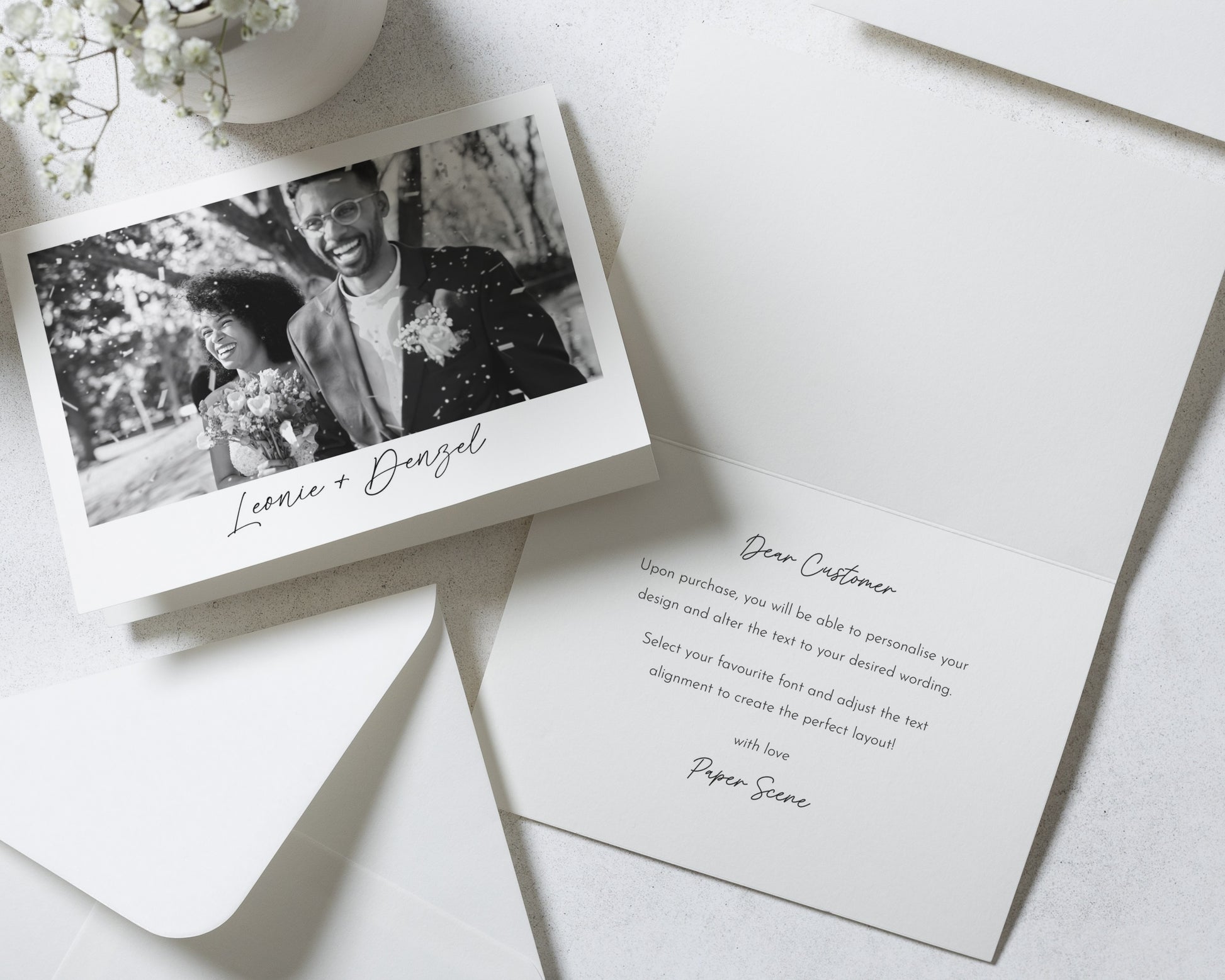 Every order includes premium heavyweight white envelopes with a diamond flap.