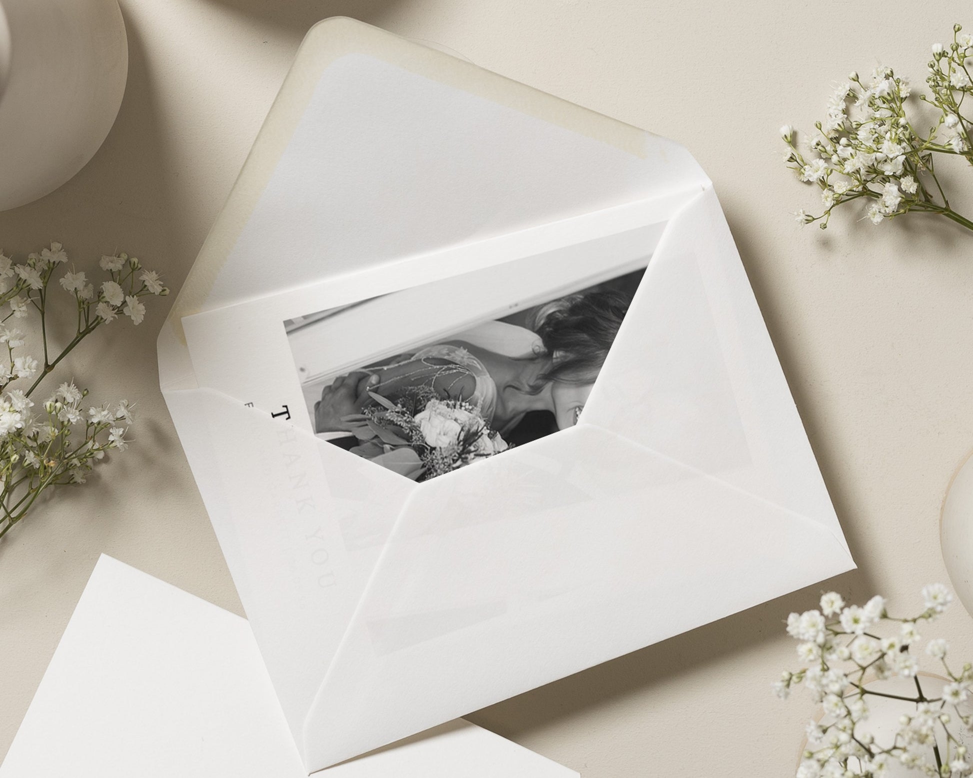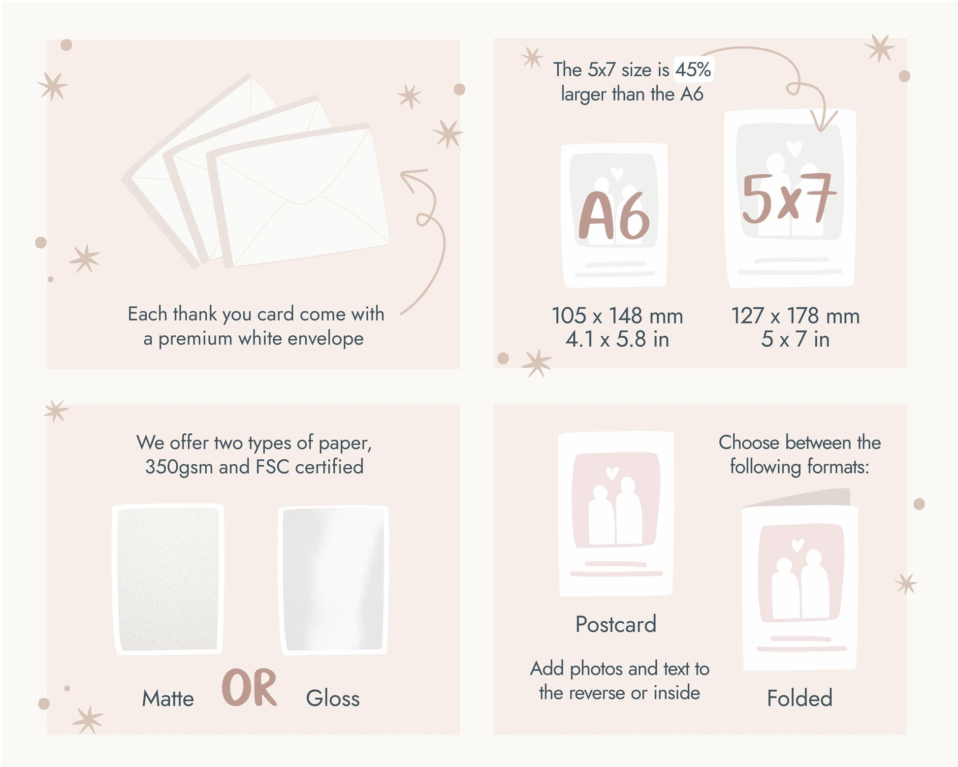 Our wedding thank you cards are fully personalised – featuring your chosen photo (or photos!) and wording to match your style. Whether you prefer something modern and minimal or a design with a touch of elegance, we’ll help you create a card that feels uniquely you.