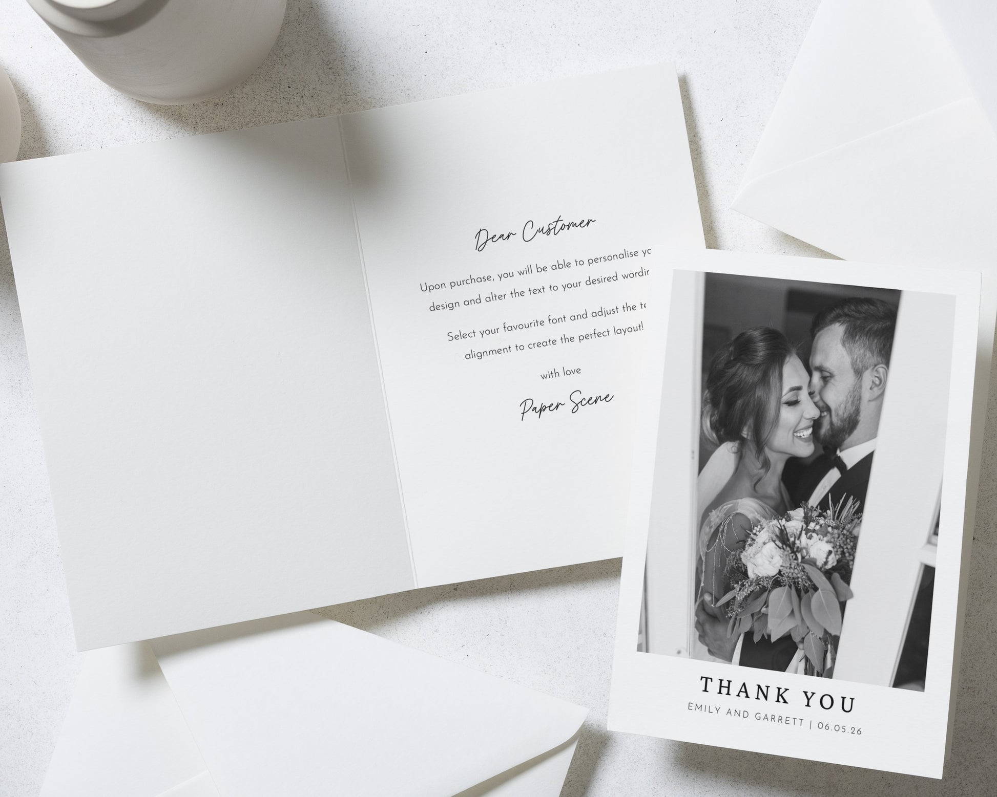 A modern, minimalist wedding thank you card featuring your favourite photo and personalised details. Perfect for sharing gratitude in style.