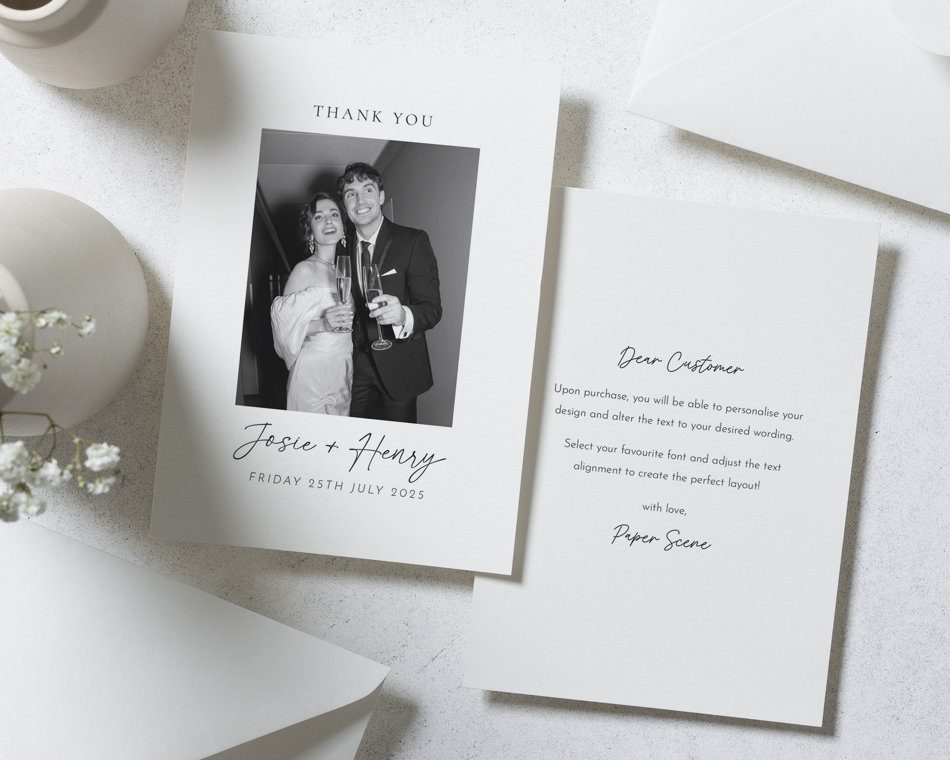 Our wedding thank you cards are fully personalised – featuring your chosen photo (or photos!) and wording to match your style. Whether you prefer something modern and minimal or a design with a touch of elegance, we’ll help you create a card that feels uniquely you.
