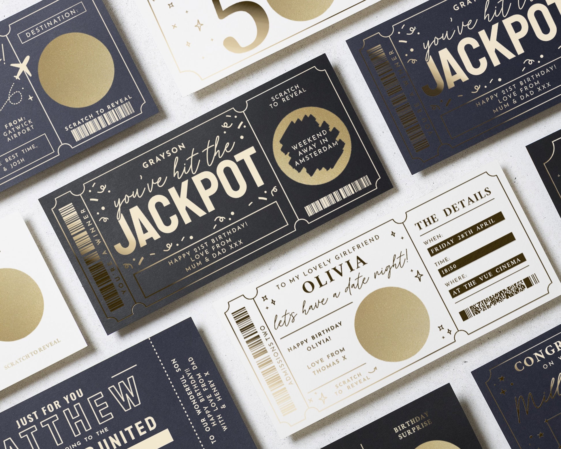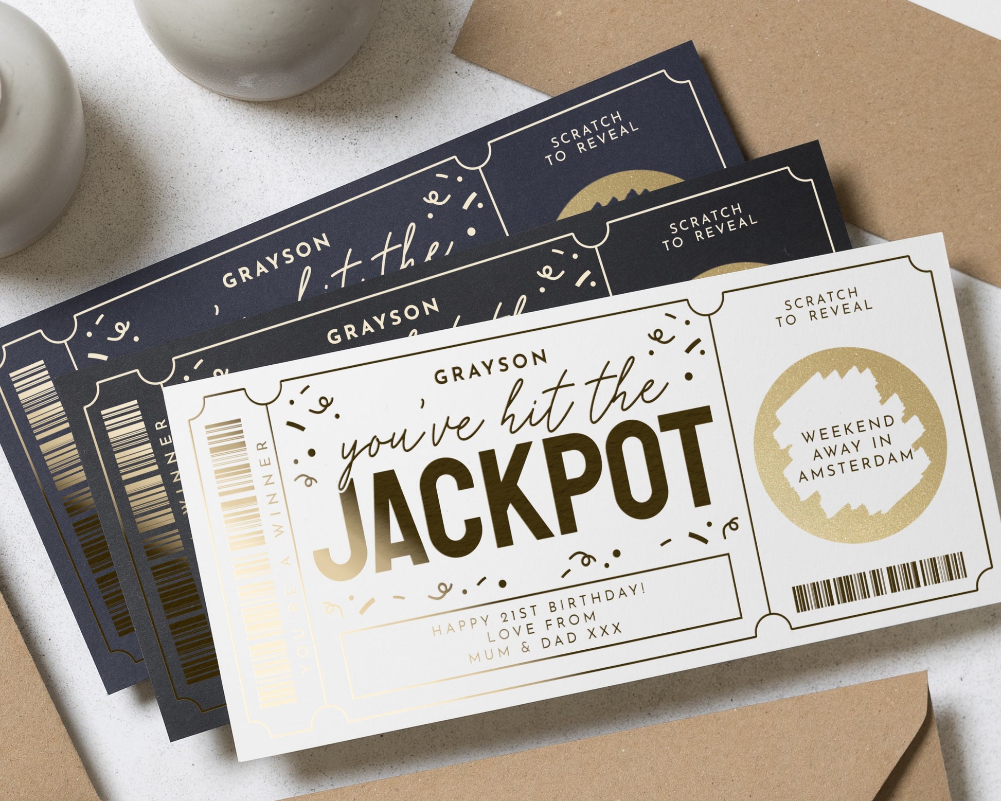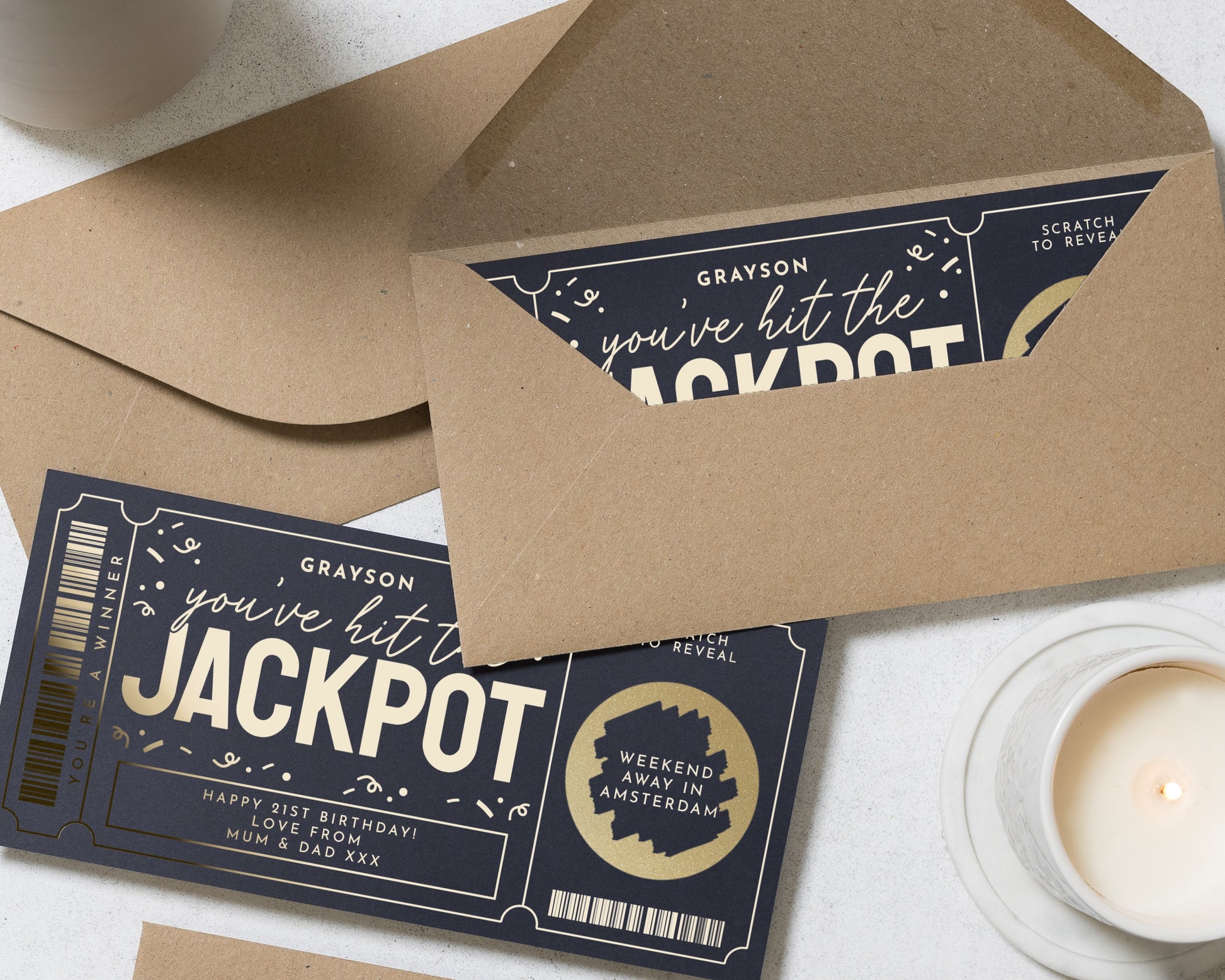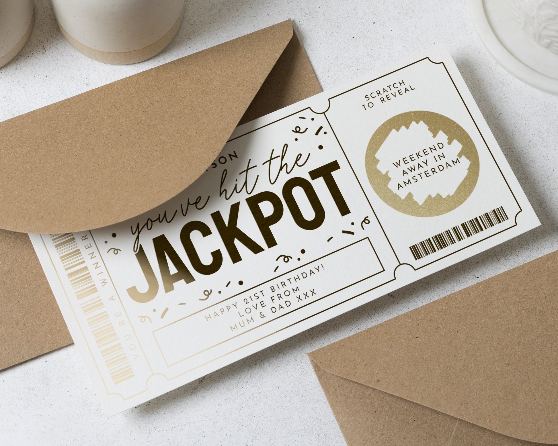 Surprise him with a gold foil scratch to reveal voucher for a weekend away! This personalised 21st birthday card is perfect for gifting an unforgettable trip.