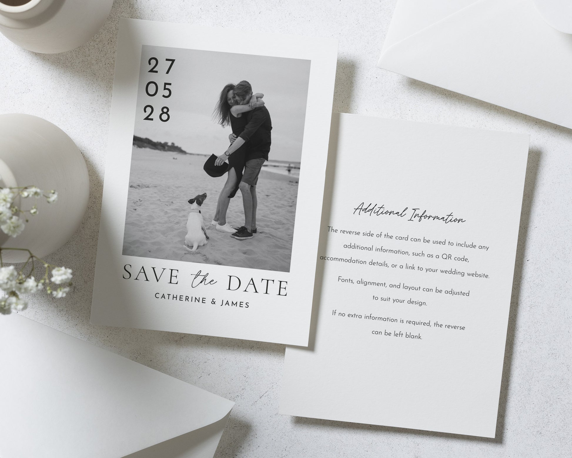 Our Save the Date cards are fully customisable – you can change all of the text to match your names, date, and wedding vibe. Whether you're planning a formal celebration or something more relaxed, we’ll help you create a design that feels uniquely you.