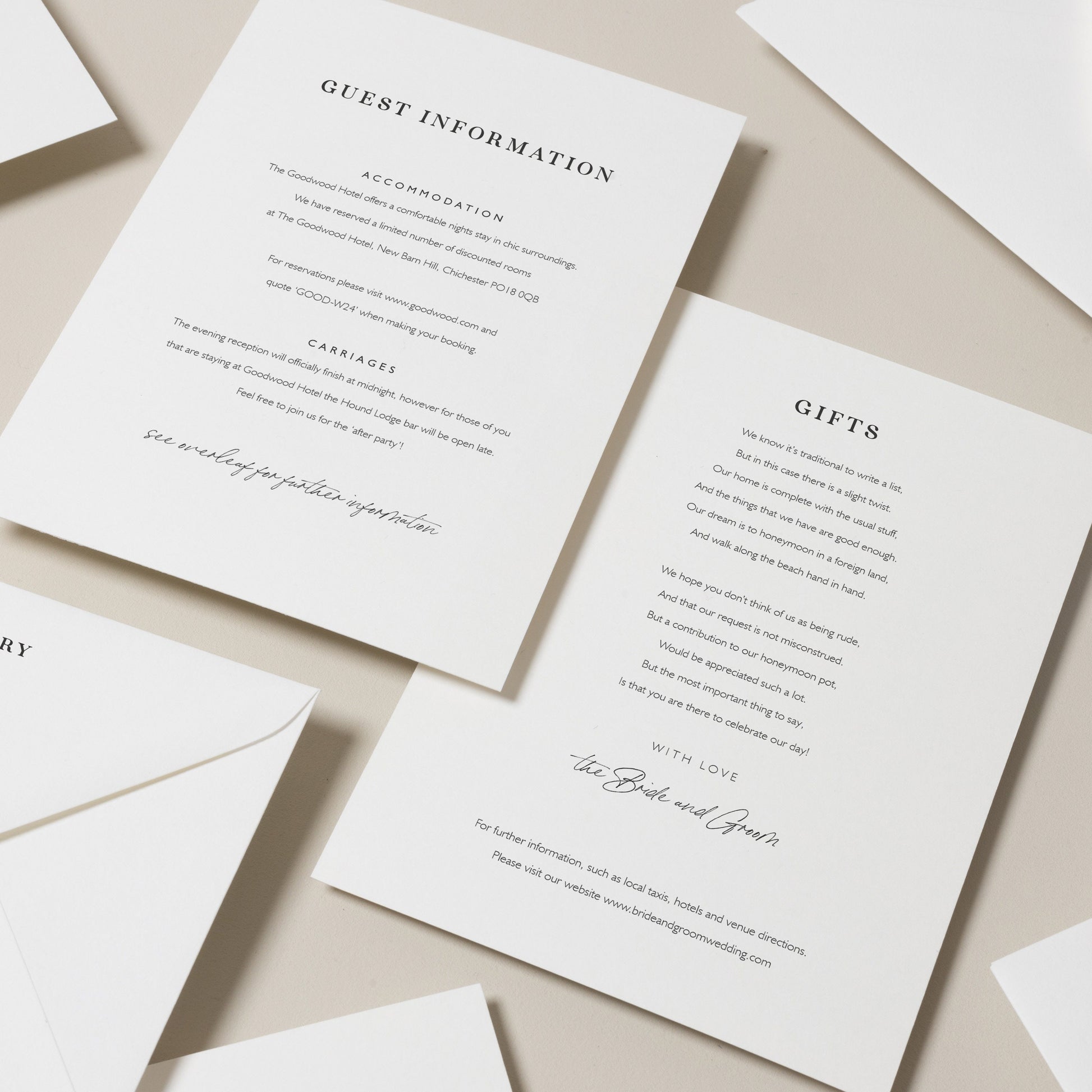 INFO CARDS: Useful for additional info such as taxi numbers, hotels, gift lists, poem's and more.