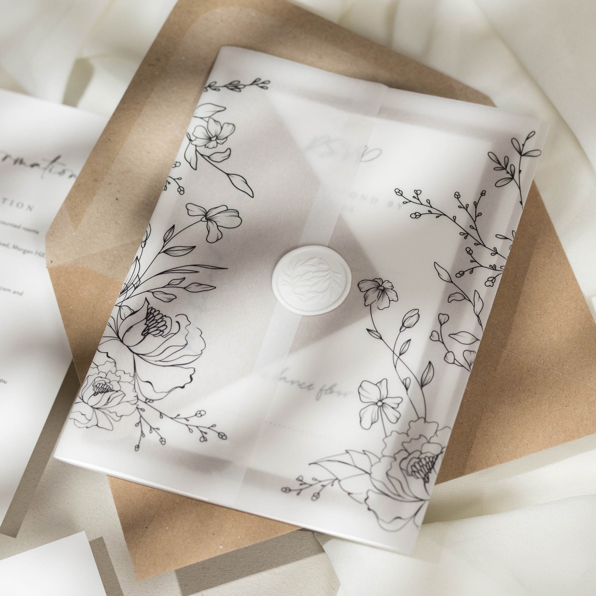 VELLUM JACKETS: Our translucent vellum jackets wrap around your invitations to add interest, texture and intrigue.