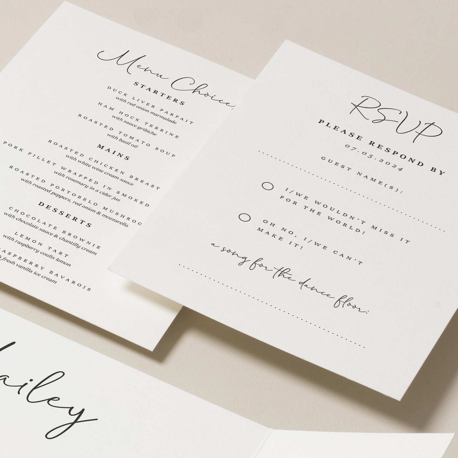 RSVPS: Choose one sided for a simple yes/no response or both sides for menu choices.
