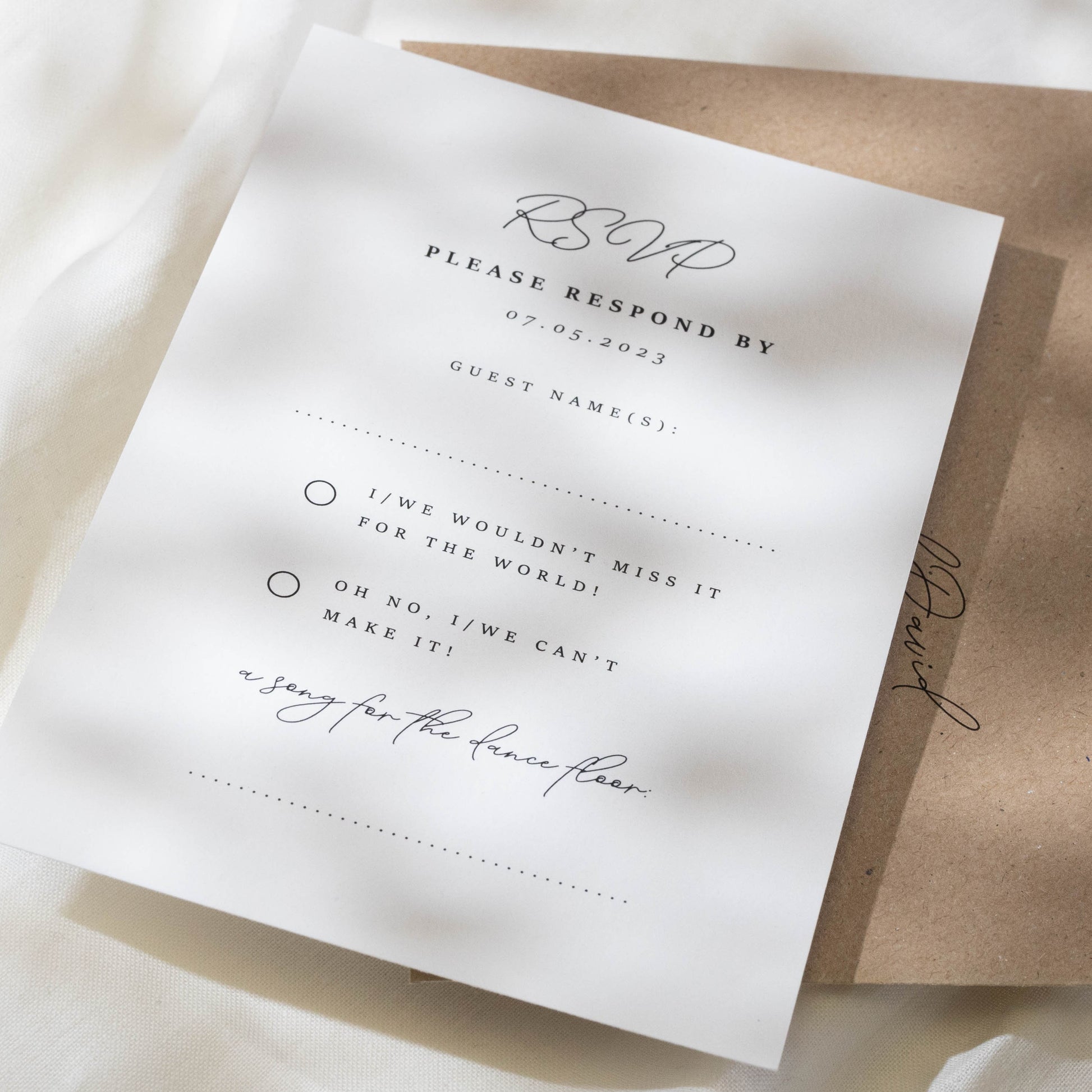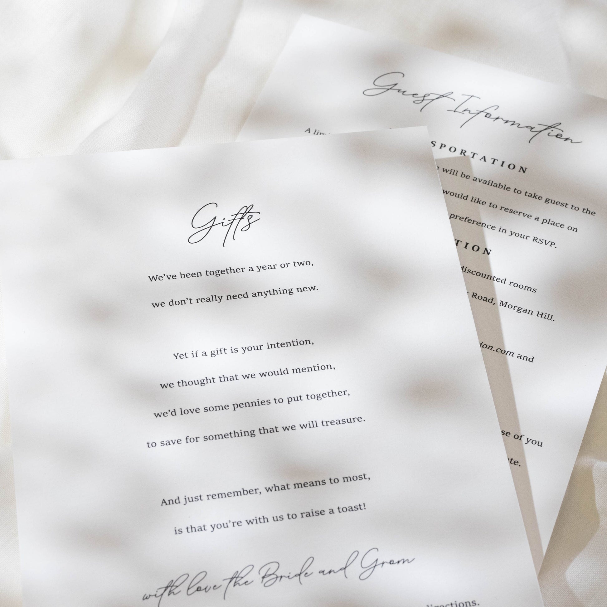 VELLUM JACKETS: Our translucent vellum jackets wrap around your invitations to add interest, texture and intrigue.